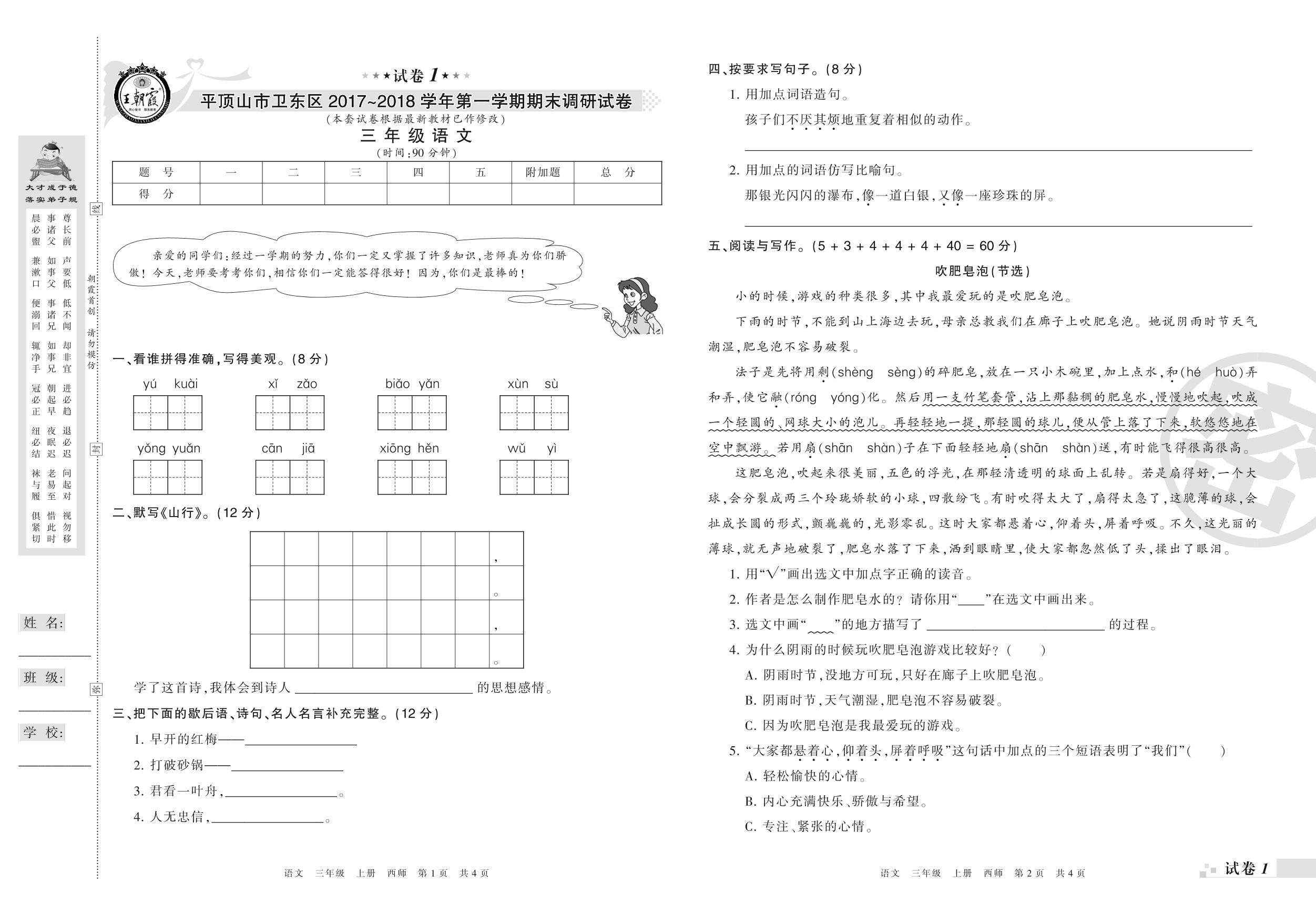 2017-2018学年第一学期平顶山市卫东区三年级语文试卷(西师版)【1】