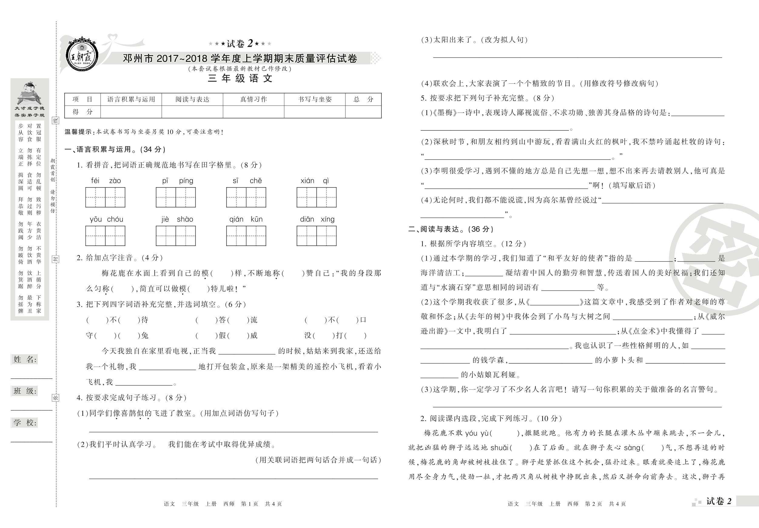 2017-2018学年第一学期邓州市三年级语文试卷(西师版)【2】