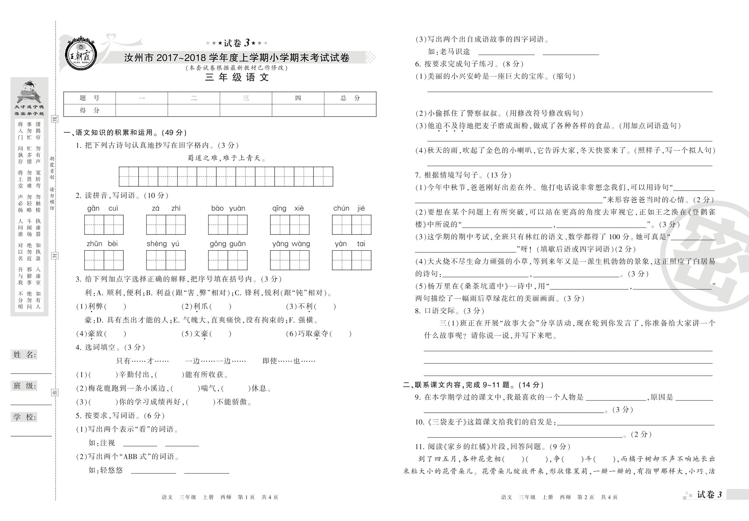 2017-2018学年第一学期汝州市三年级语文试卷(西师版)【3】