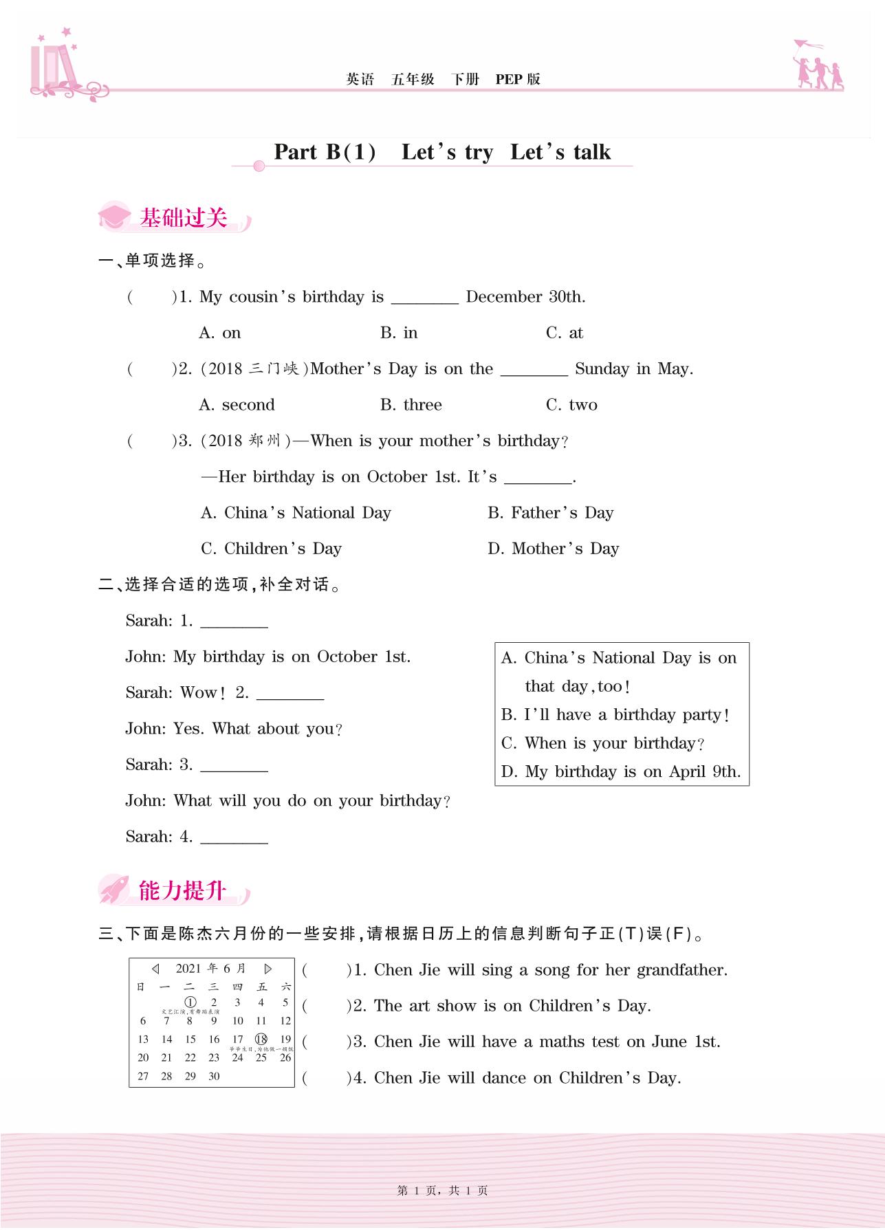 2021下册五年级英语PEP版 Unit 4—Part B(1) Let’s try Let’s talk