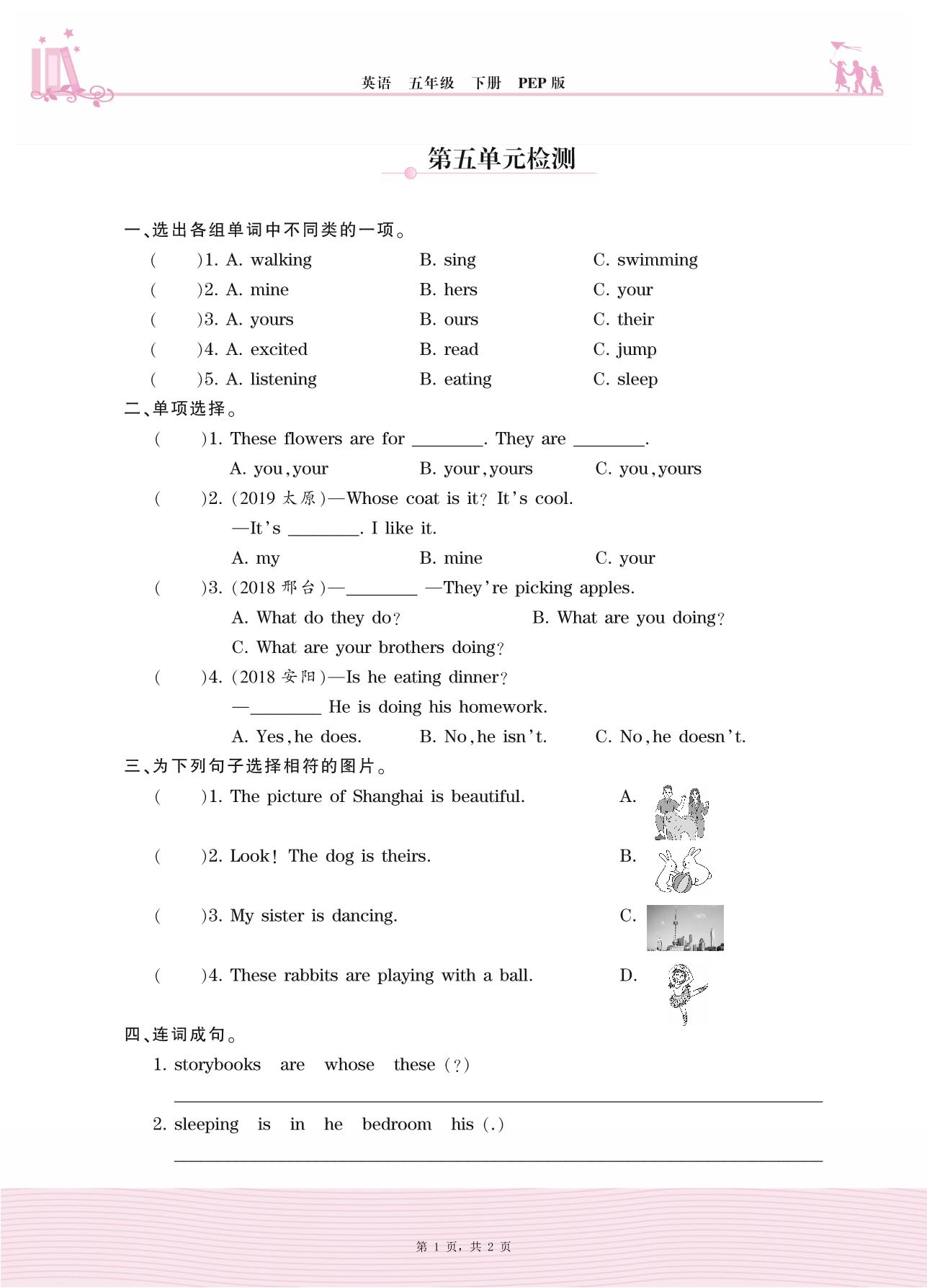 五年级英语人教PEP版(三起始)下册单元卷