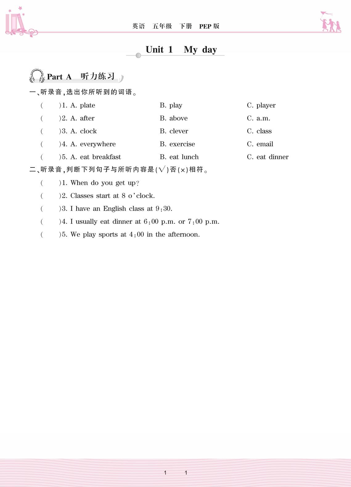 2021下册五年级英语PEP版 Unit 1 My day—Part A
