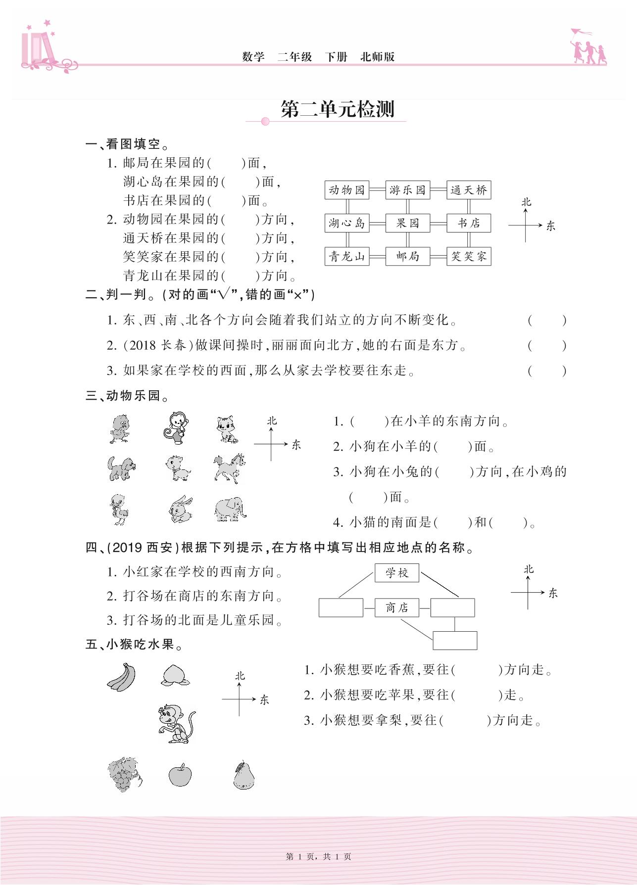 2021下册二年级数学北师版 二 方向与位置——第二单元检测