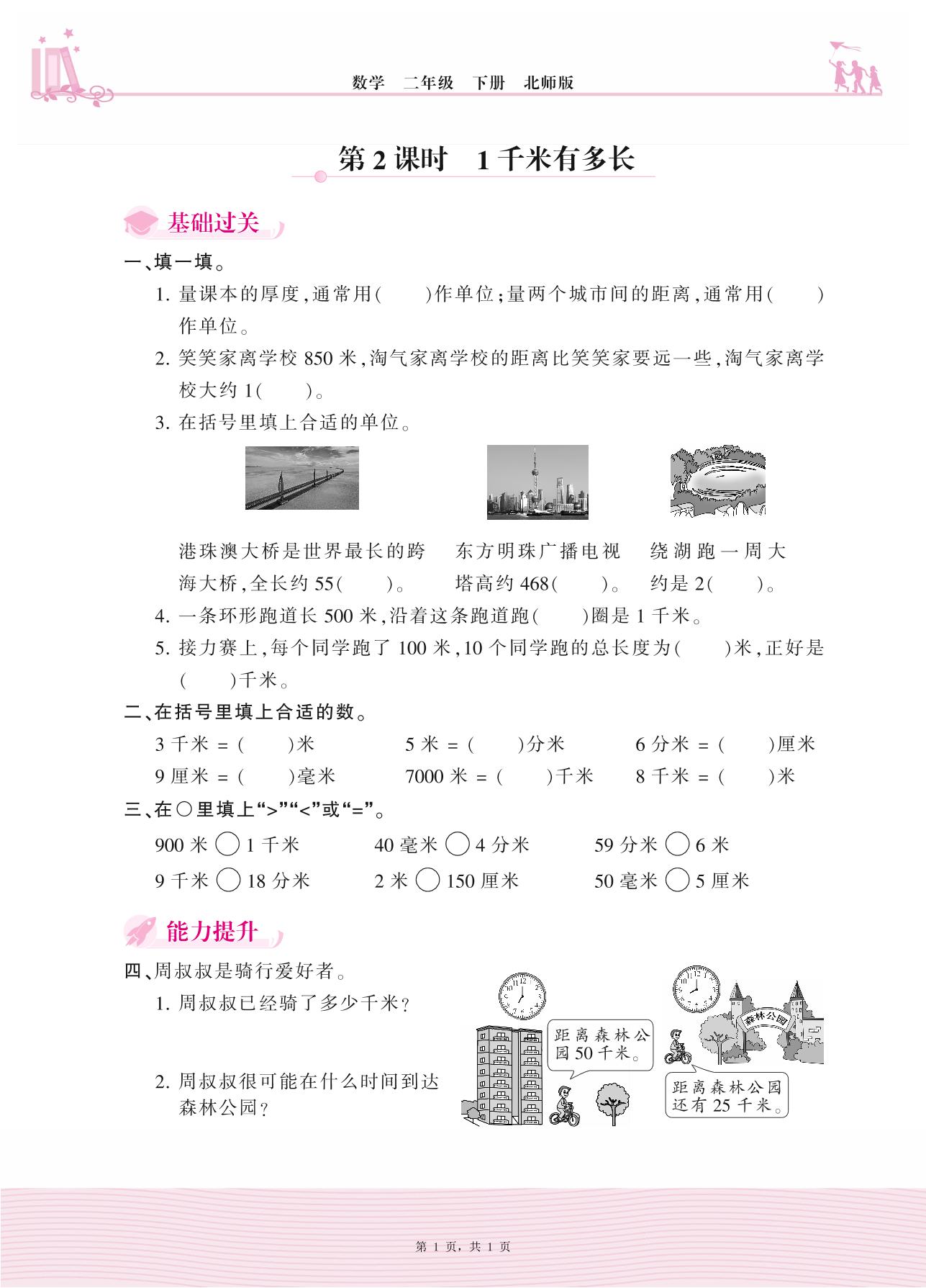 2021下册二年级数学北师版 四 测量——第2课时 1千米有多长
