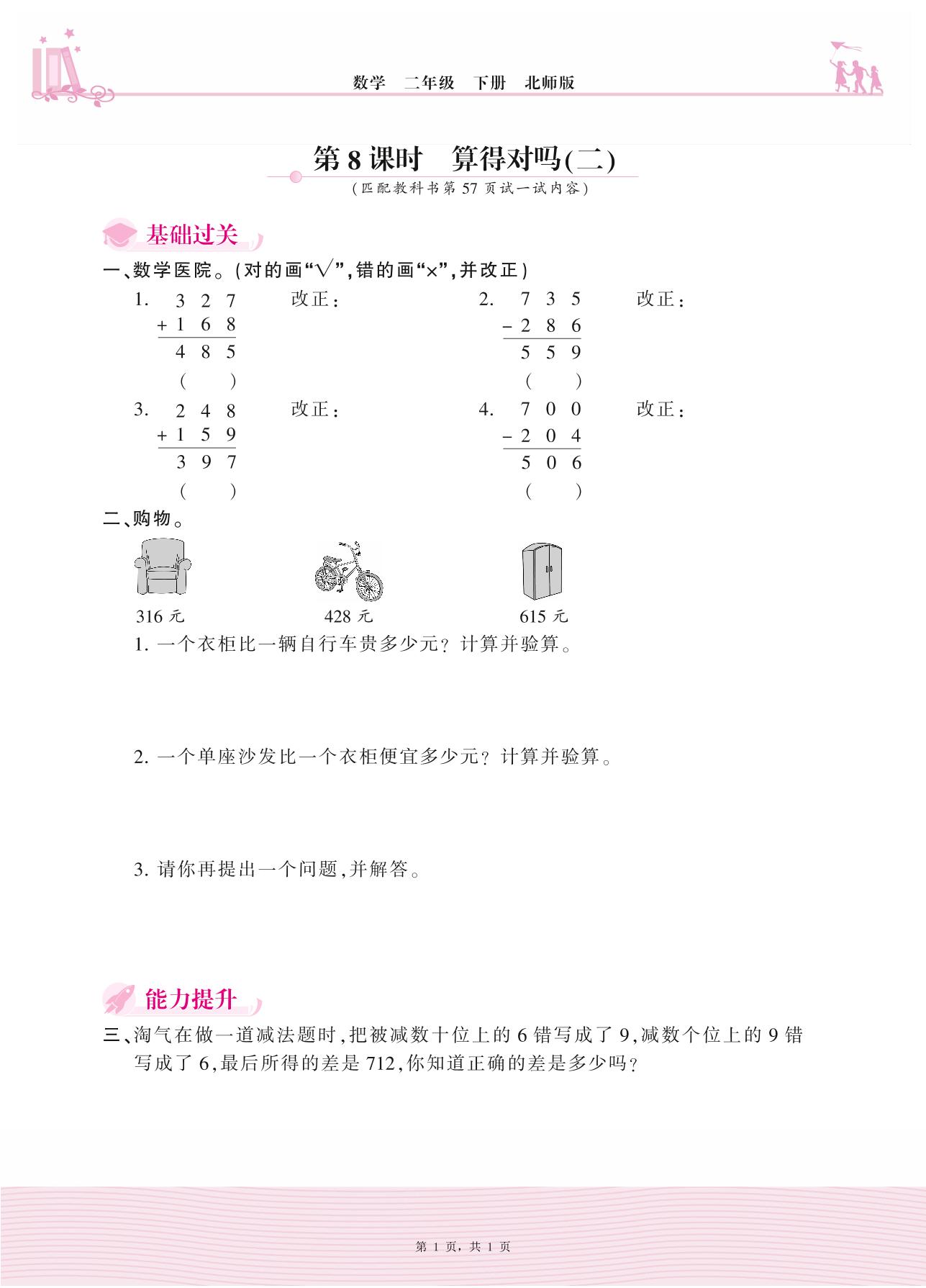 2021下册二年级数学北师版 五 加与减——第8课时 算得对吗(二)