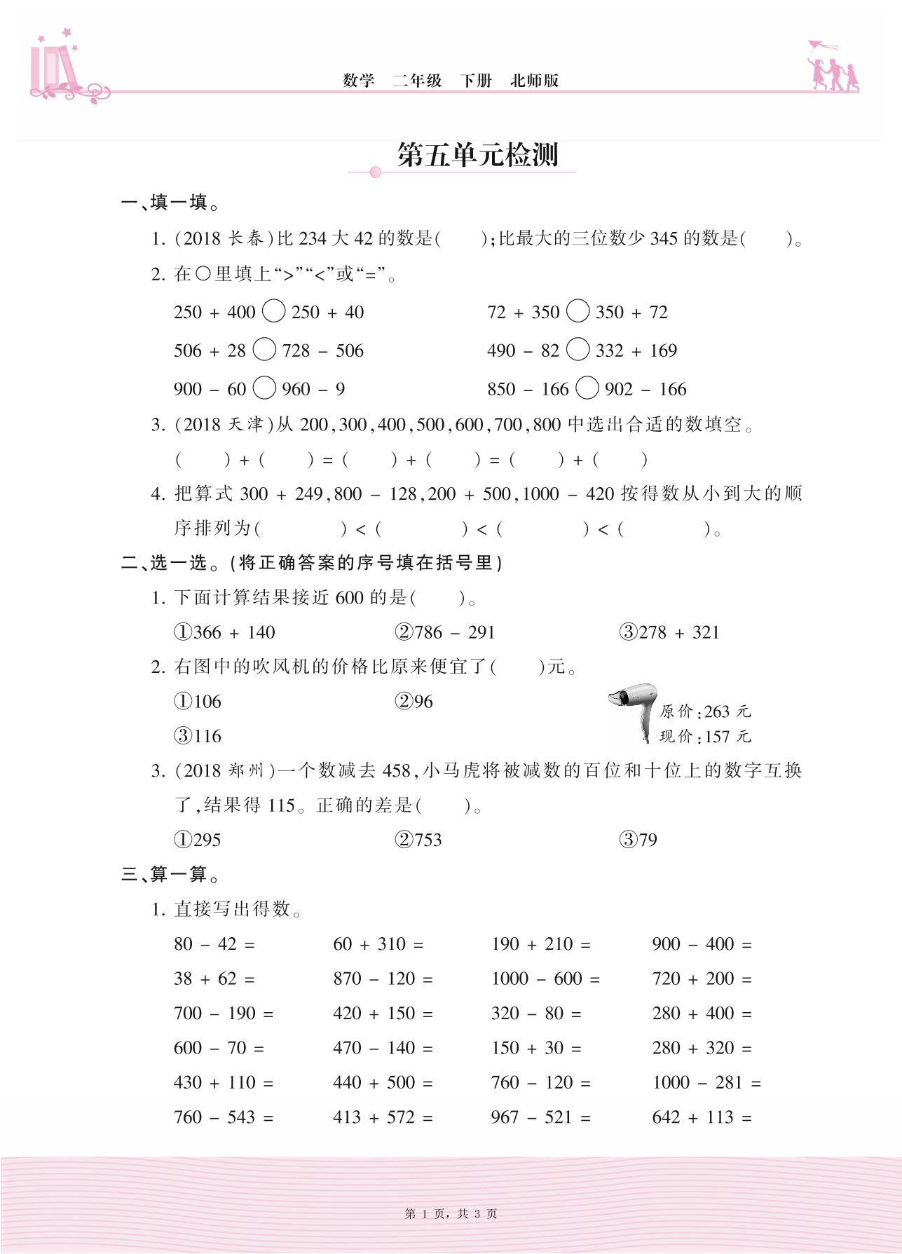2021下册二年级数学北师版 五 加与减——第五单元检测
