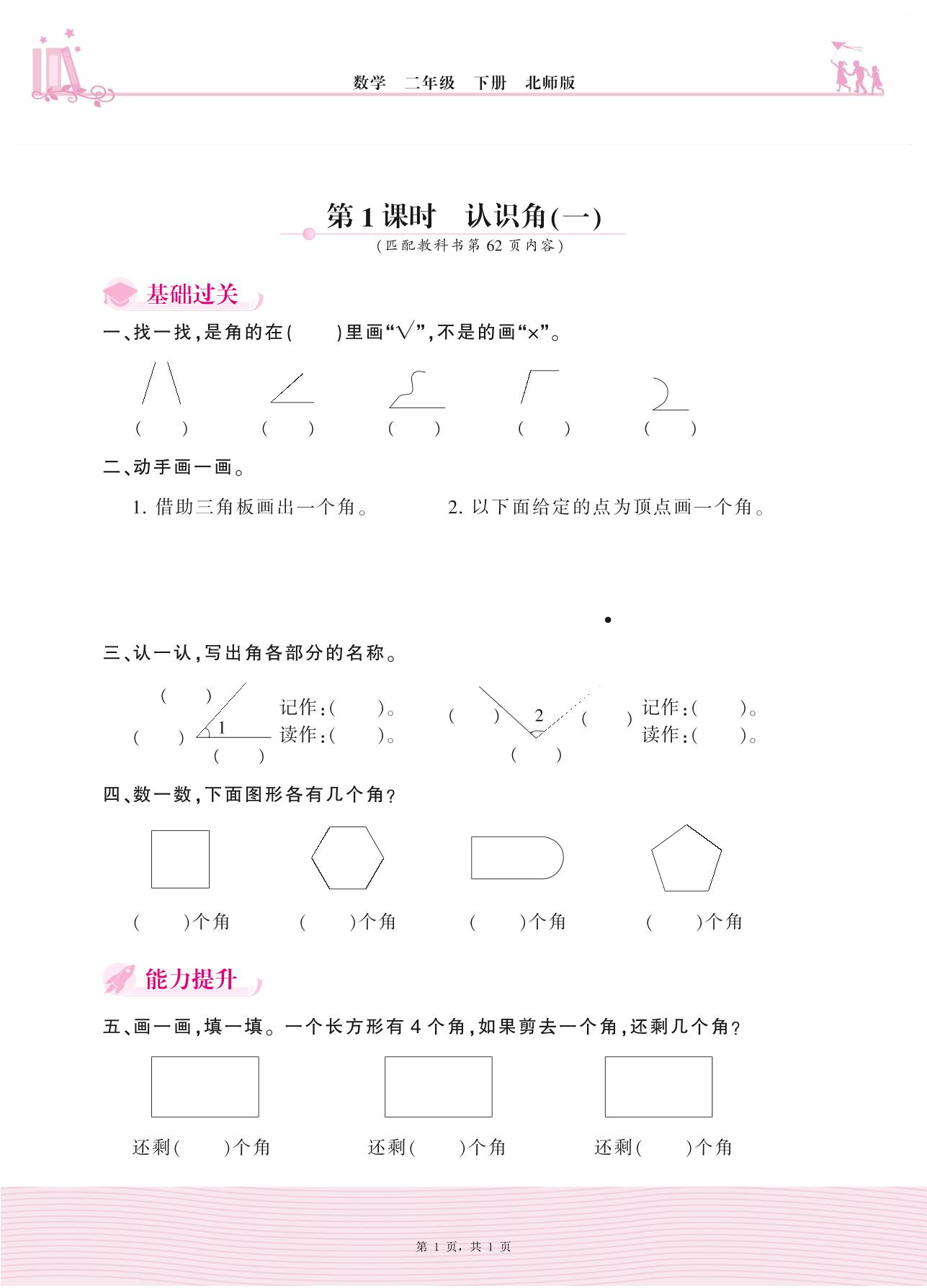 2021下册二年级数学北师版 六 认识图形——第1课时 认识角(一)