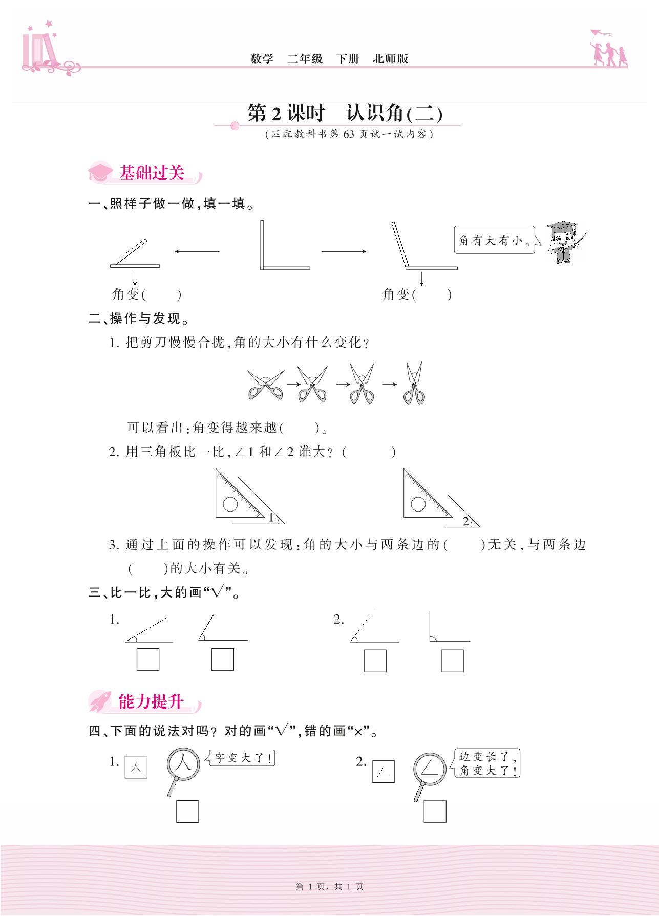 2021下册二年级数学北师版 六 认识图形——第2课时 认识角(二)