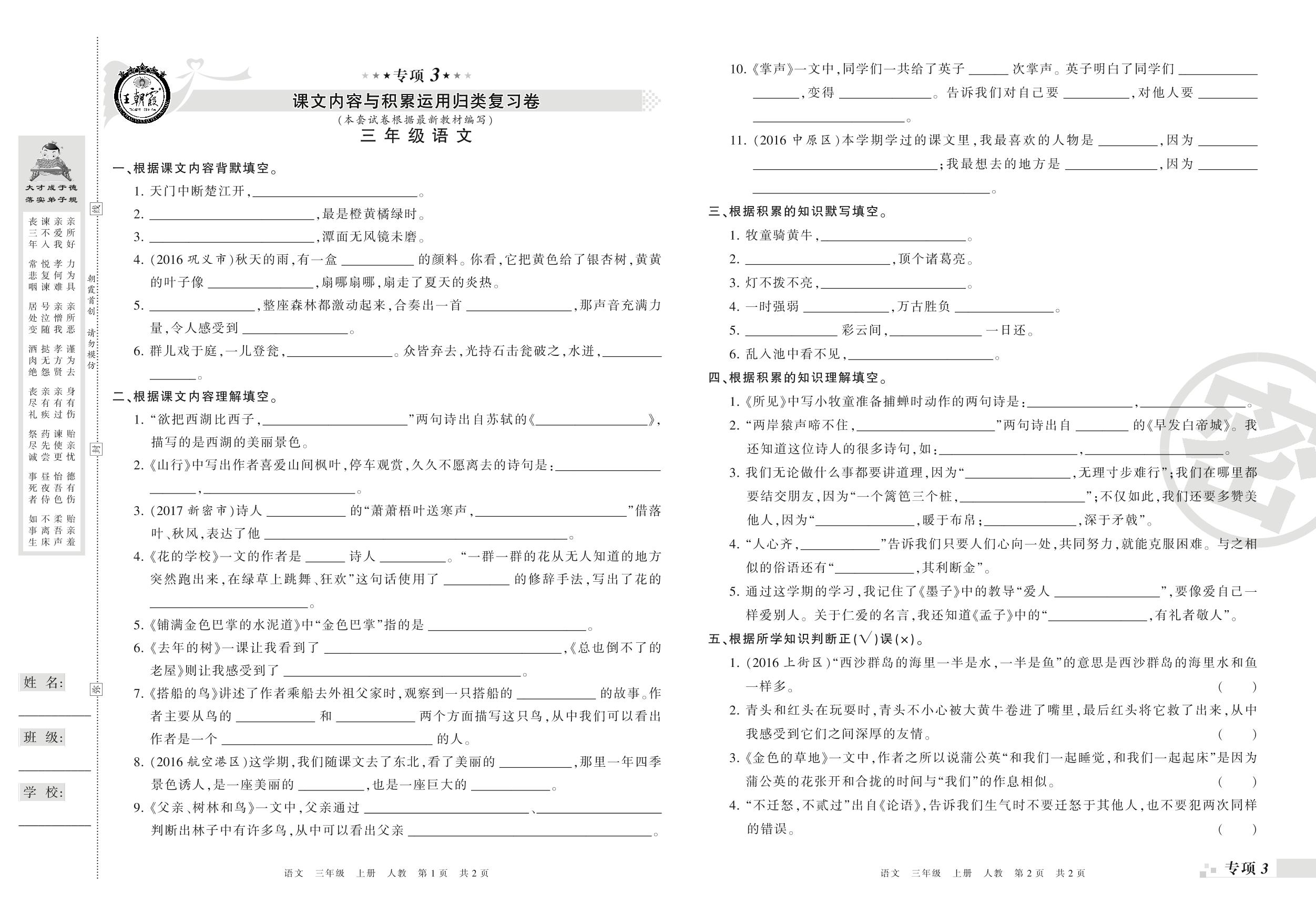 三年级语文人教版上册专项卷