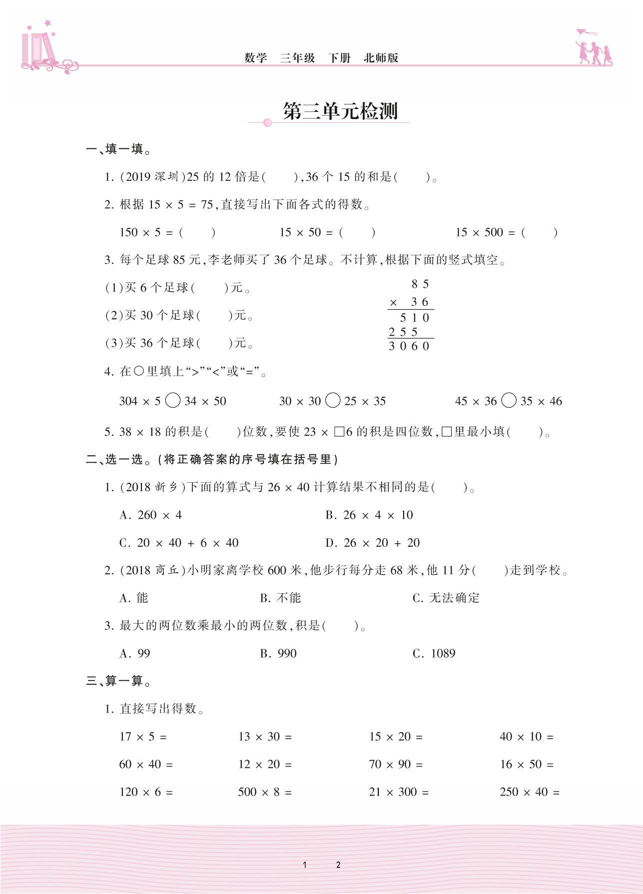 2021下册三年级数学北师版 三 乘法——第三单元检测