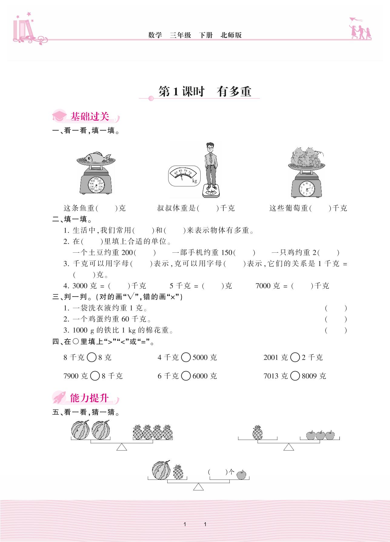 2021下册三年级数学北师版 四 千克、克、吨——第1课时 有多重