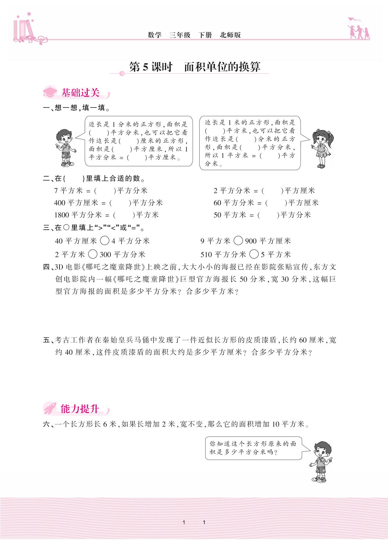 2021下册三年级数学北师版 五 面积——第5课时 面积单位的换算