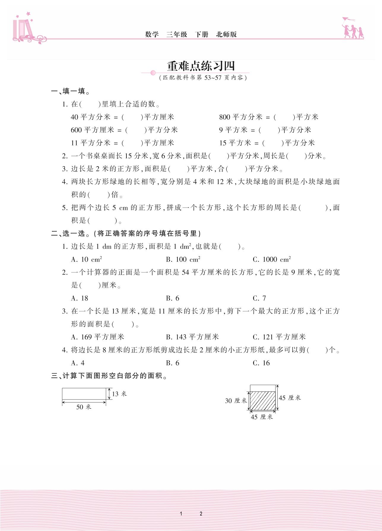 2021下册三年级数学北师版 五 面积——重难点练习四