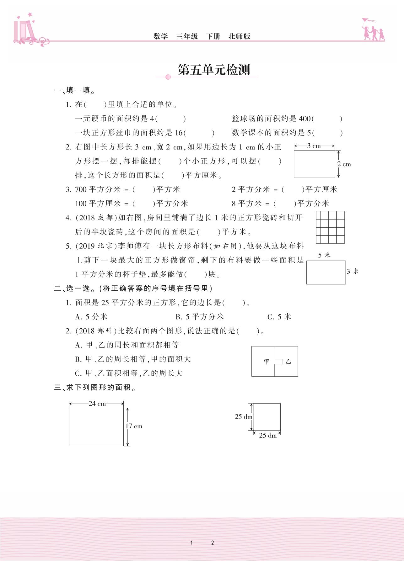 2021下册三年级数学北师版 五 面积——第五单元检测