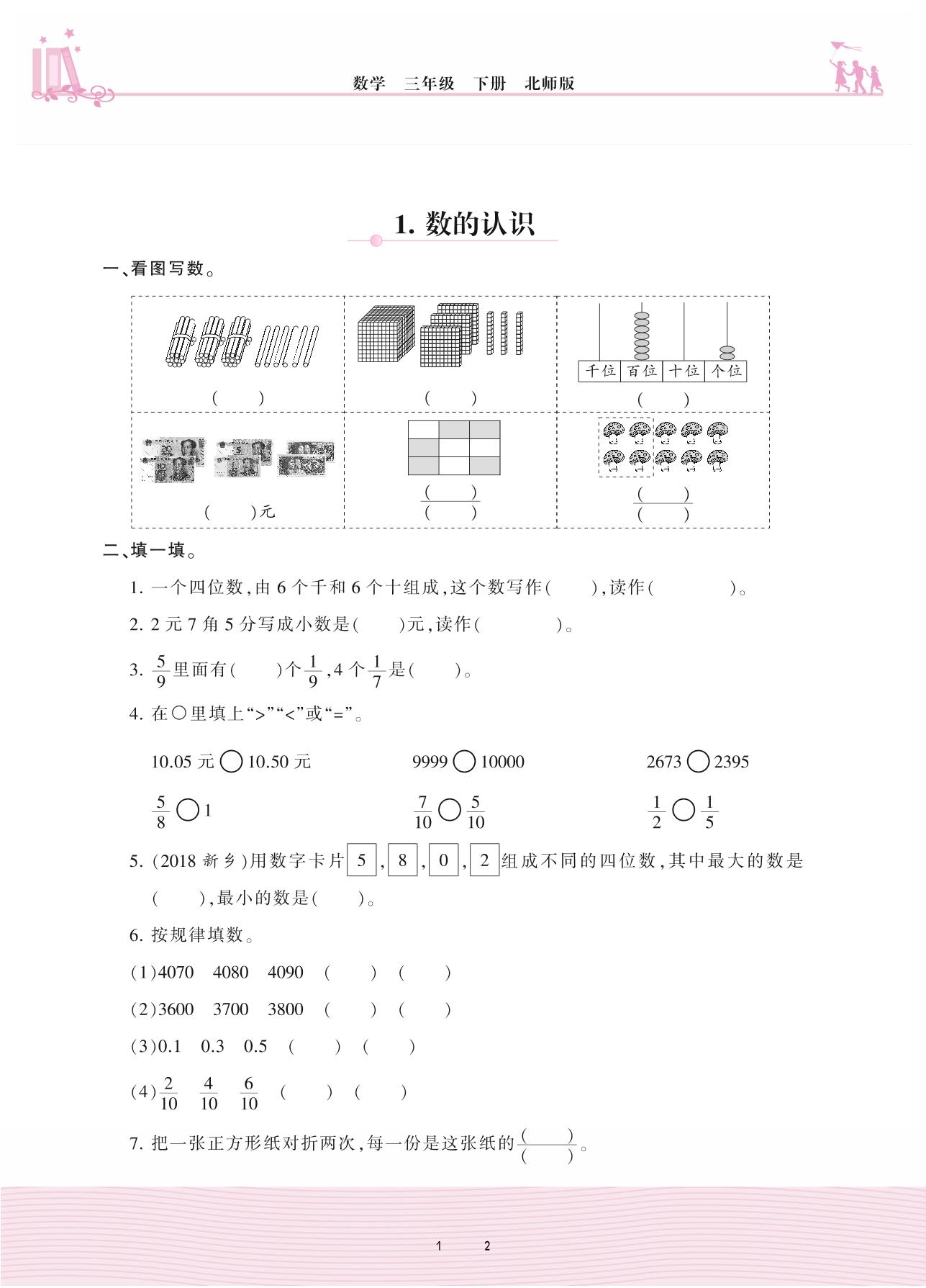2021下册三年级数学北师版 总复习——1. 数的认识