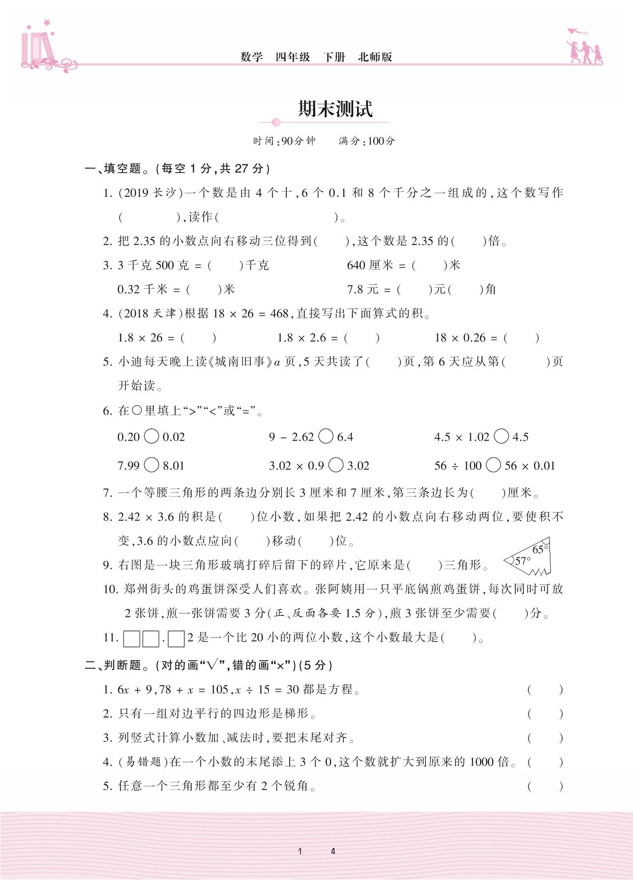 四年级数学北师版下册期末卷