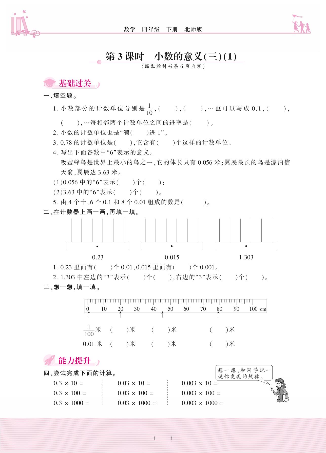 2021下册四年级数学北师版 一 小数的意义和加减法——第3课时 小数的意义(三)(1)