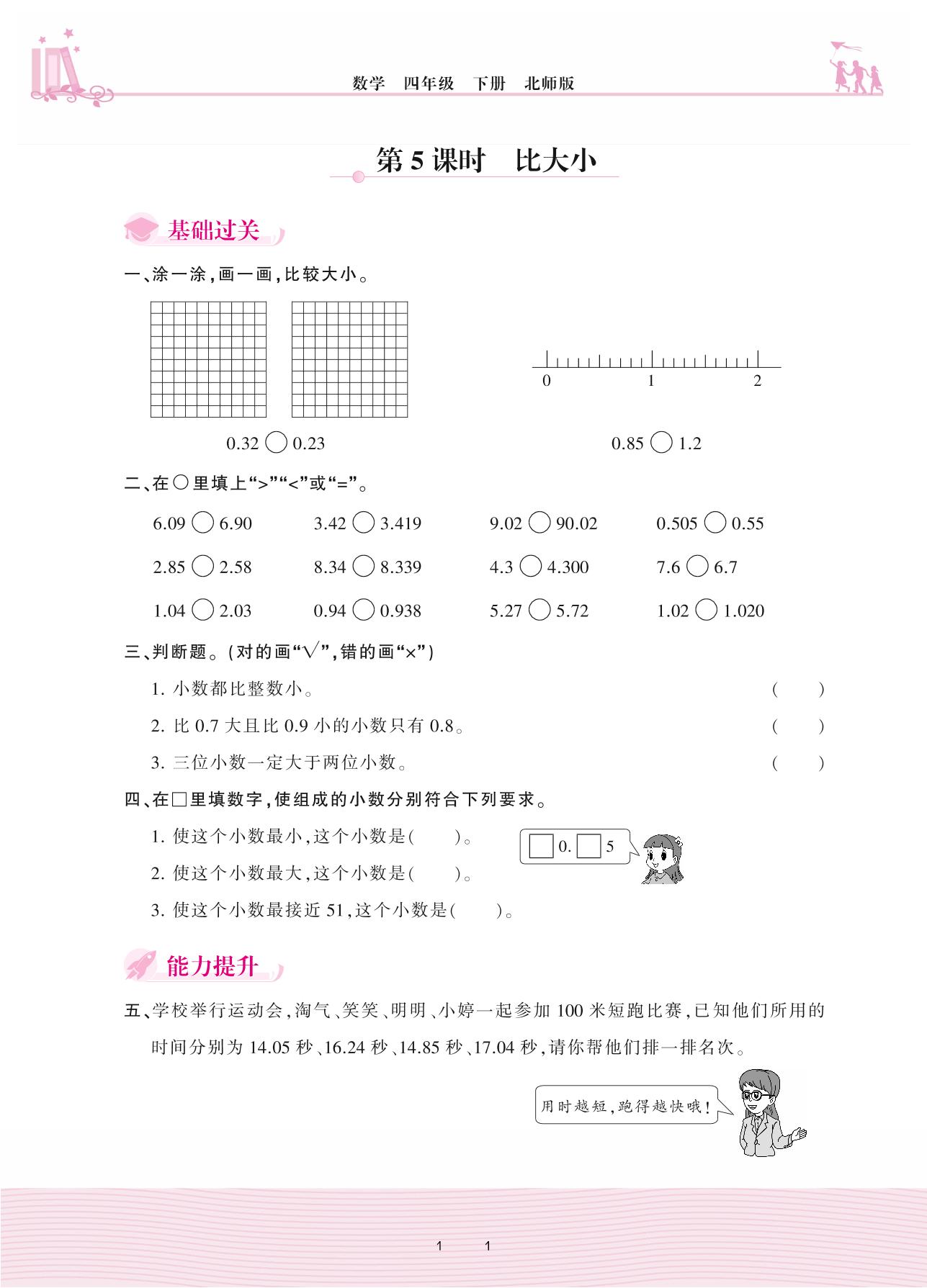 2021下册四年级数学北师版 一 小数的意义和加减法——第5课时 比大小