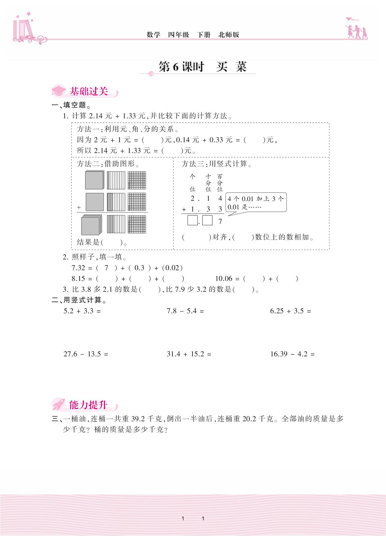 2021下册四年级数学北师版 一 小数的意义和加减法——第6课时 买菜
