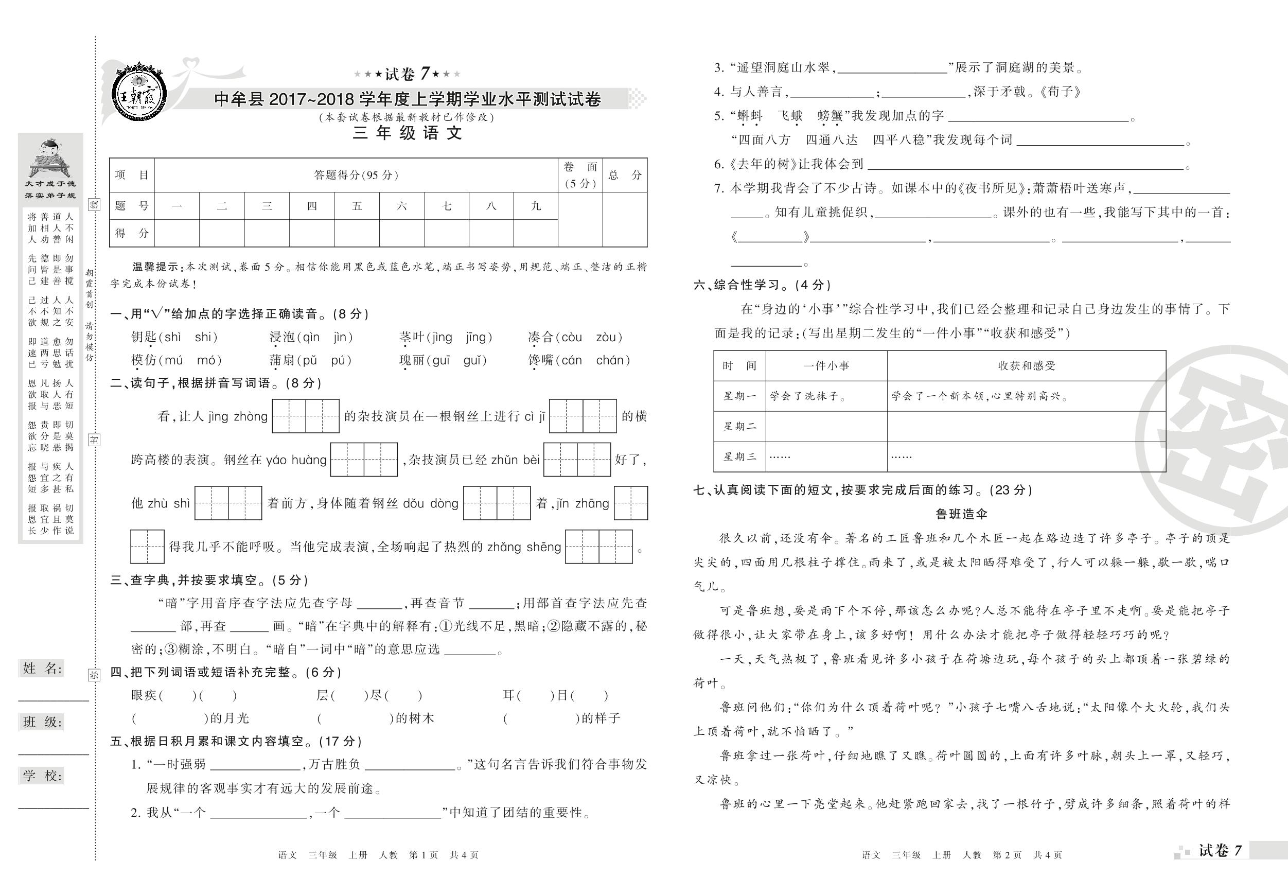 2017-2018学年第一学期郑州市中牟县三年级语文试卷(人教版)【7】
