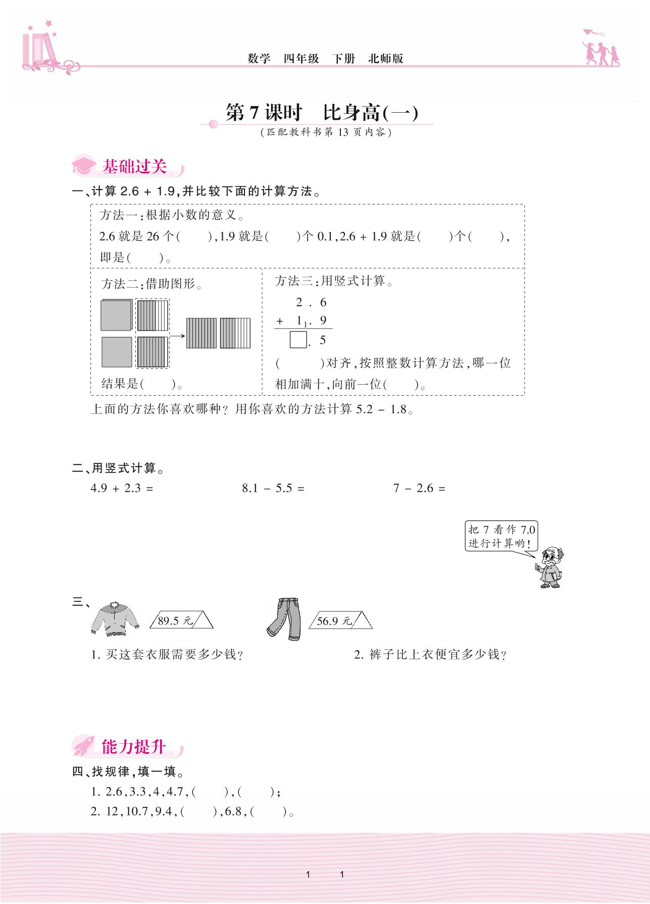 2021下册四年级数学北师版 一 小数的意义和加减法——第7课时 比身高(一)