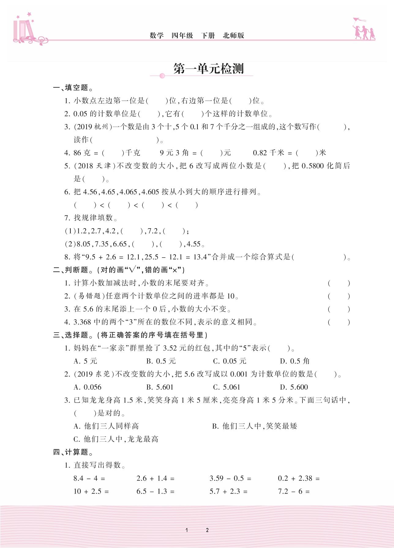 2021下册四年级数学北师版 一 小数的意义和加减法——第一单元检测
