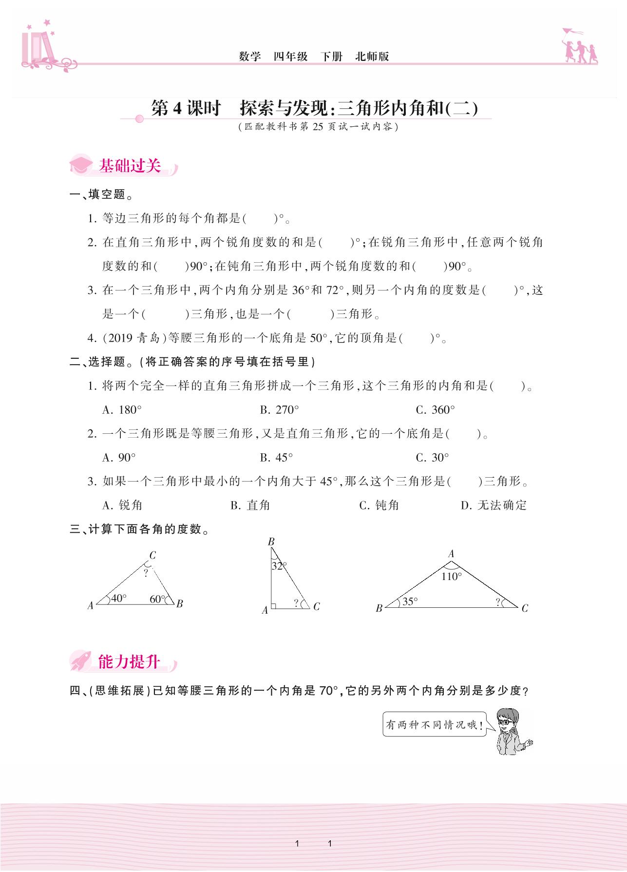 2021下册四年级数学北师版 二 认识三角形和四边形——第4课时 探索与发现:三角形内角和(二)