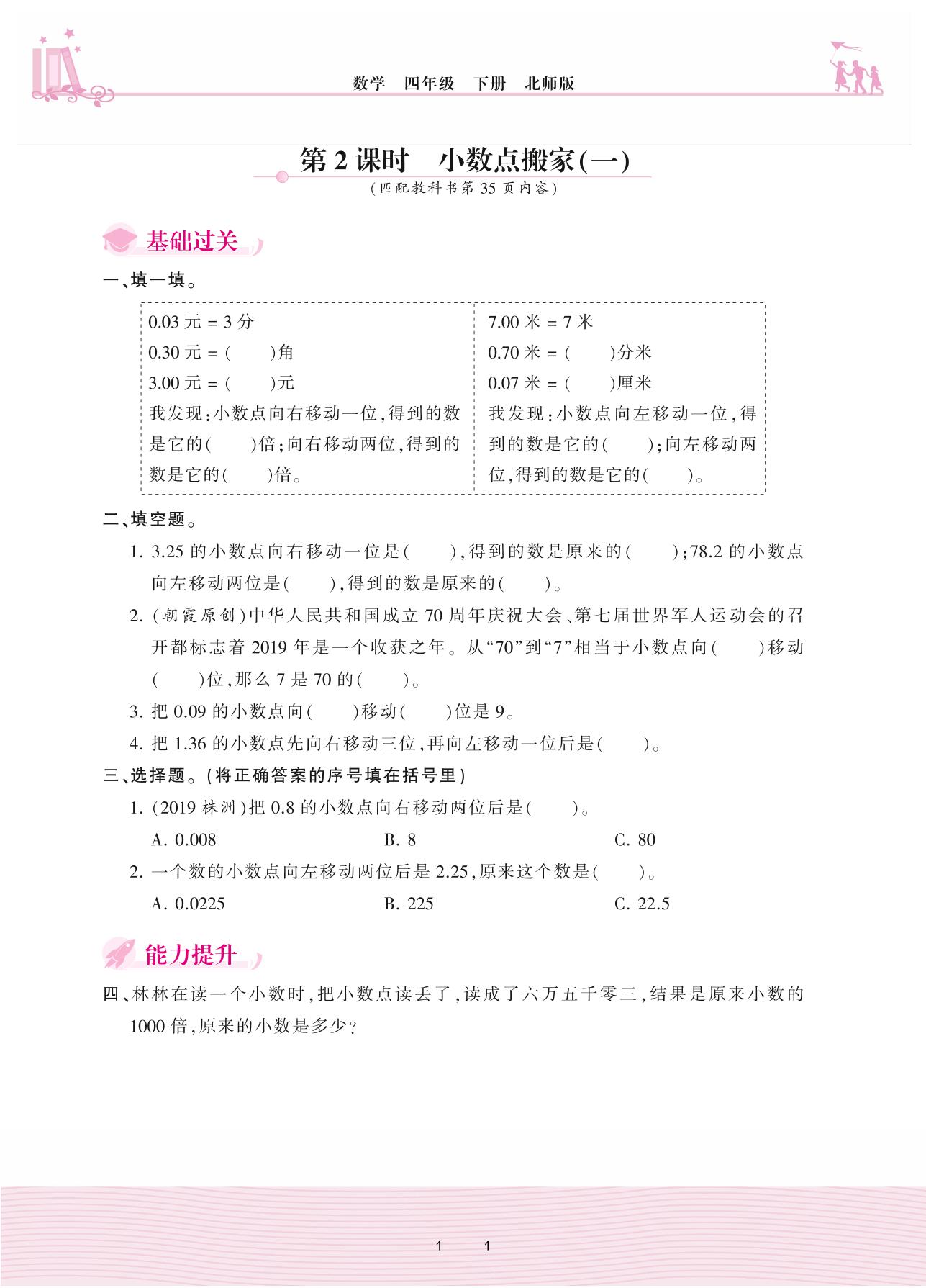 2021下册四年级数学北师版 三 小数乘法——第2课时 小数点搬家(一)