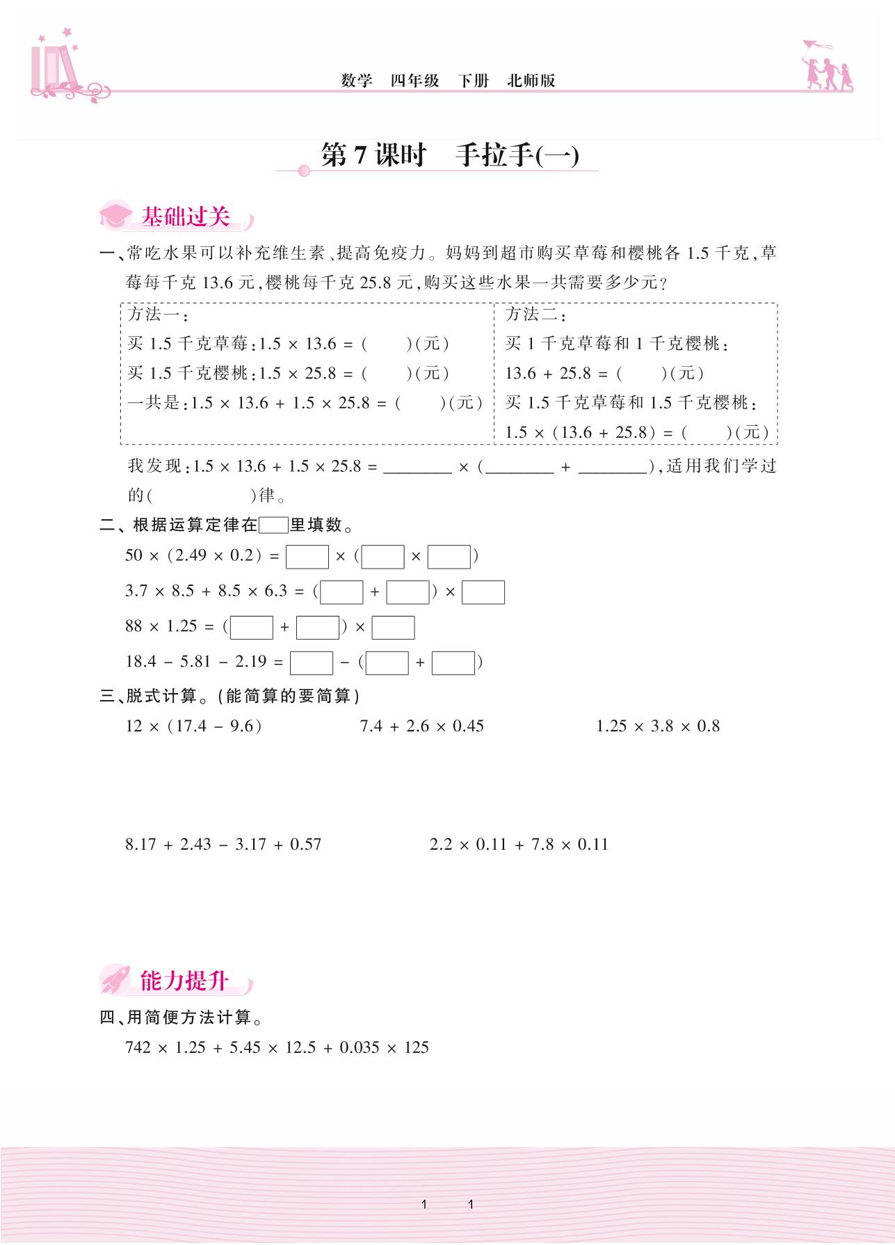 2021下册四年级数学北师版 三 小数乘法——第7课时 手拉手(一)