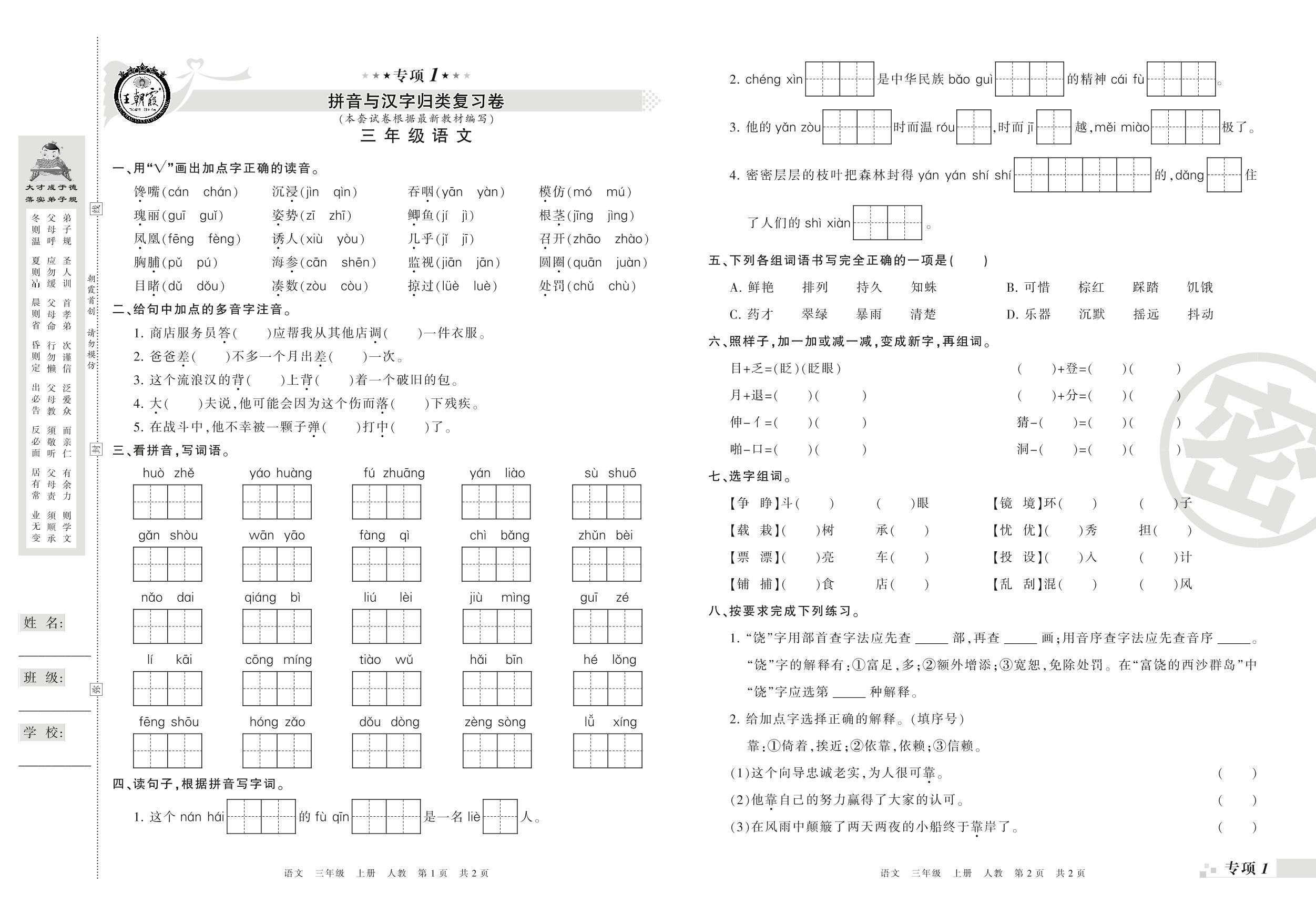 王朝霞期末专项卷——拼音与汉字、词语真题归类复习三年级上册语文(人教版)_R210801103309【0】