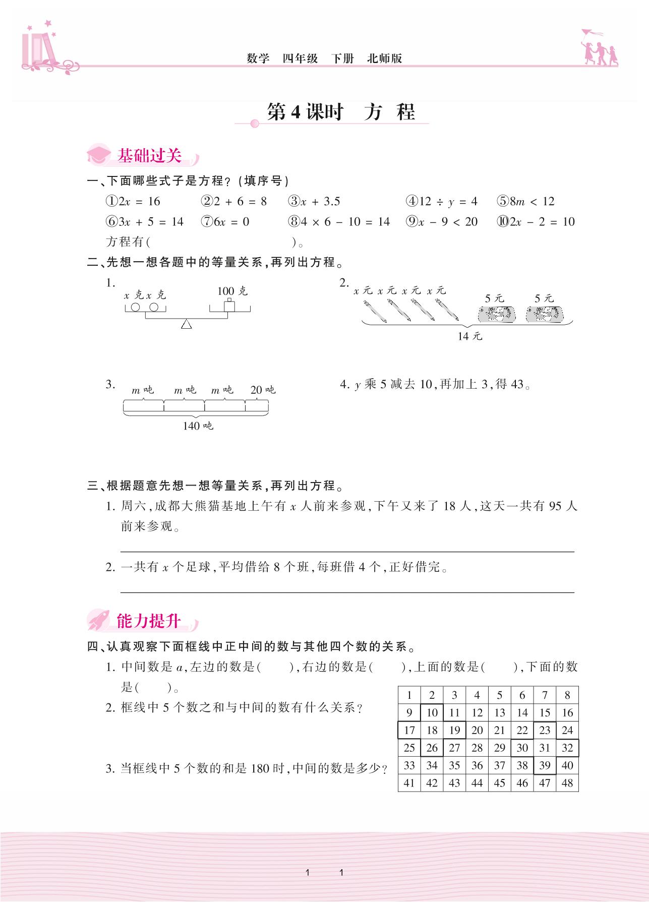 2021下册四年级数学北师版 五 认识方程——第4课时 方程