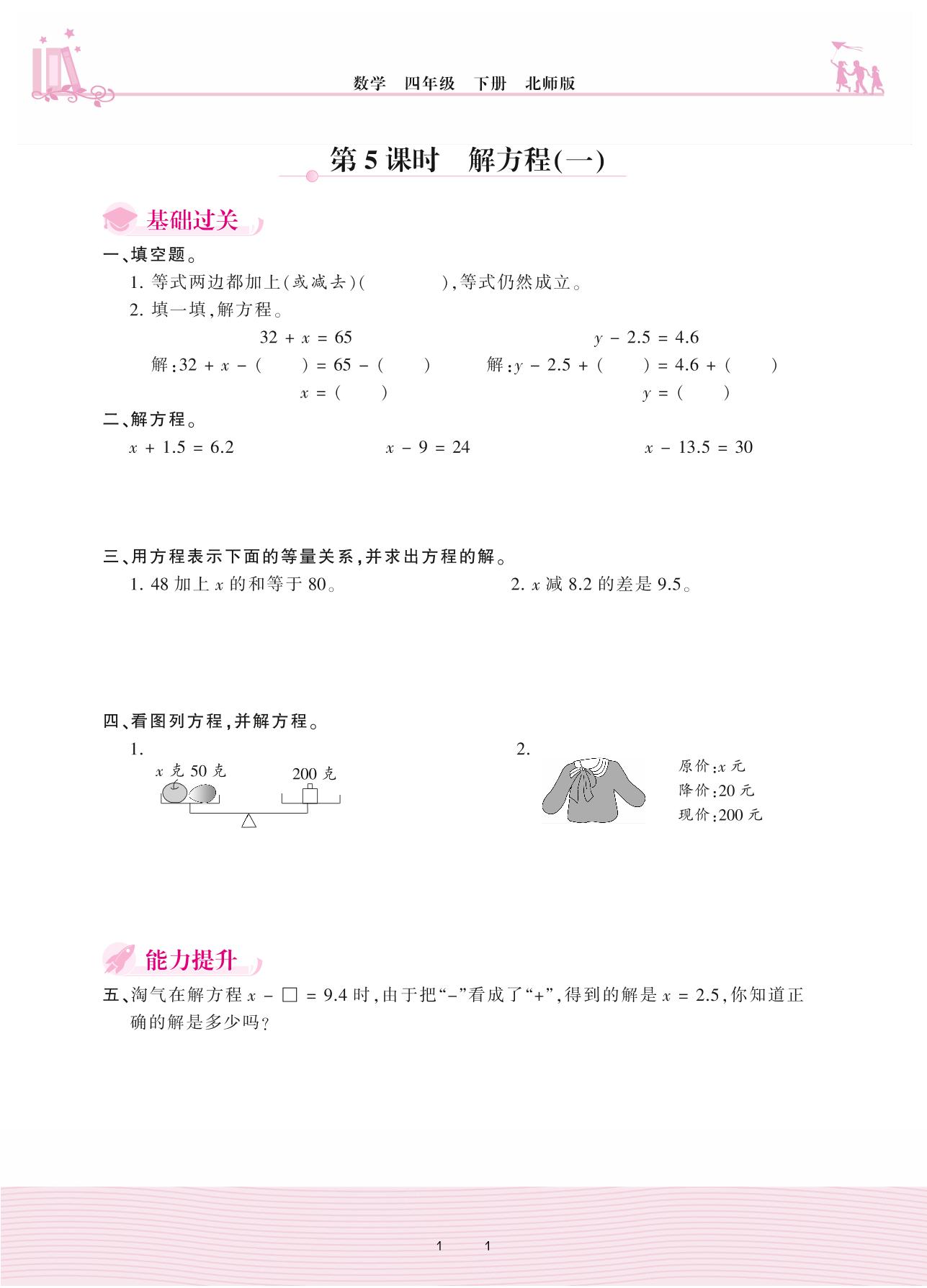 2021下册四年级数学北师版 五 认识方程——第5课时 解方程(一)