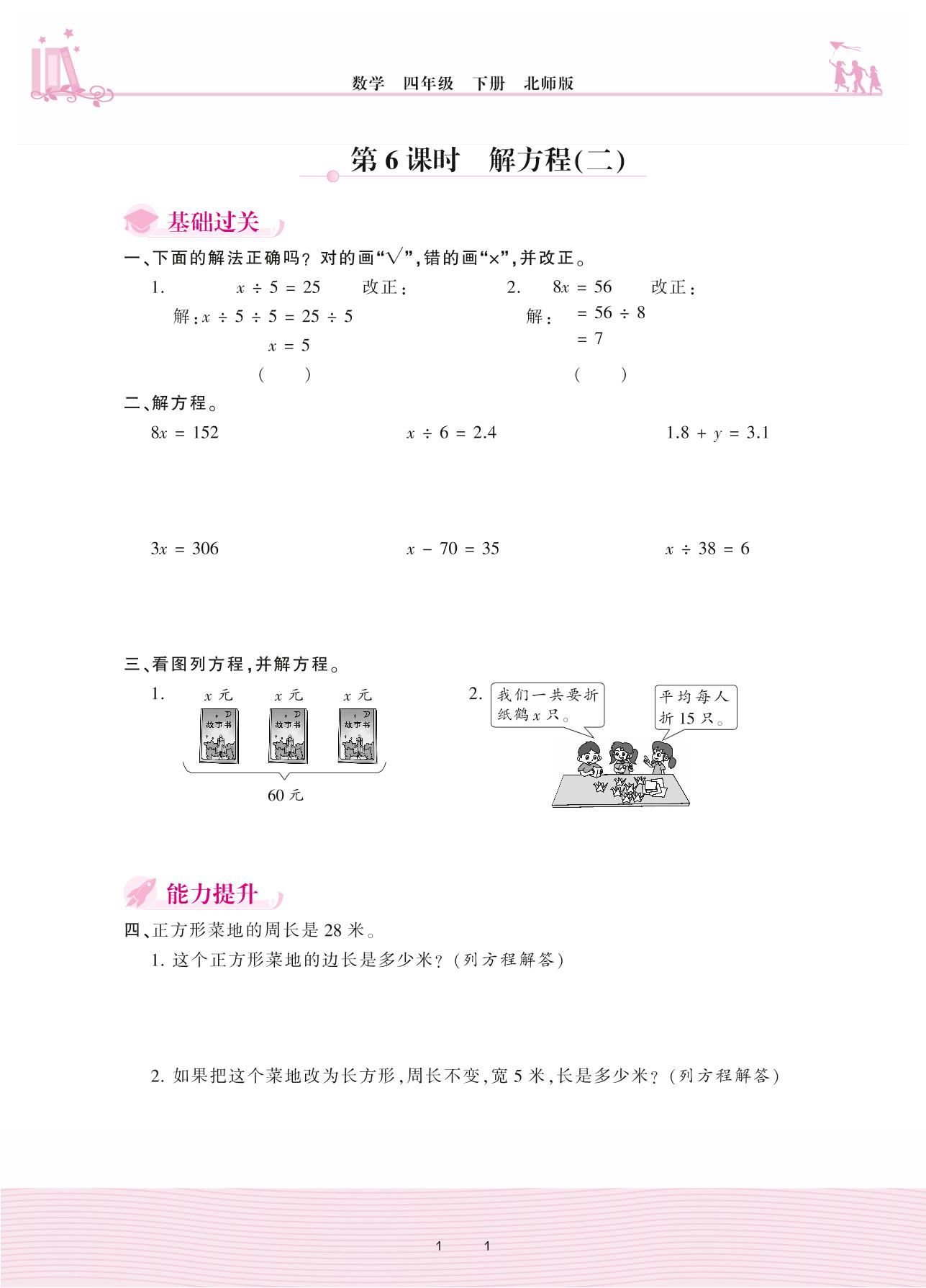 2021下册四年级数学北师版 五 认识方程——第6课时 解方程(二)