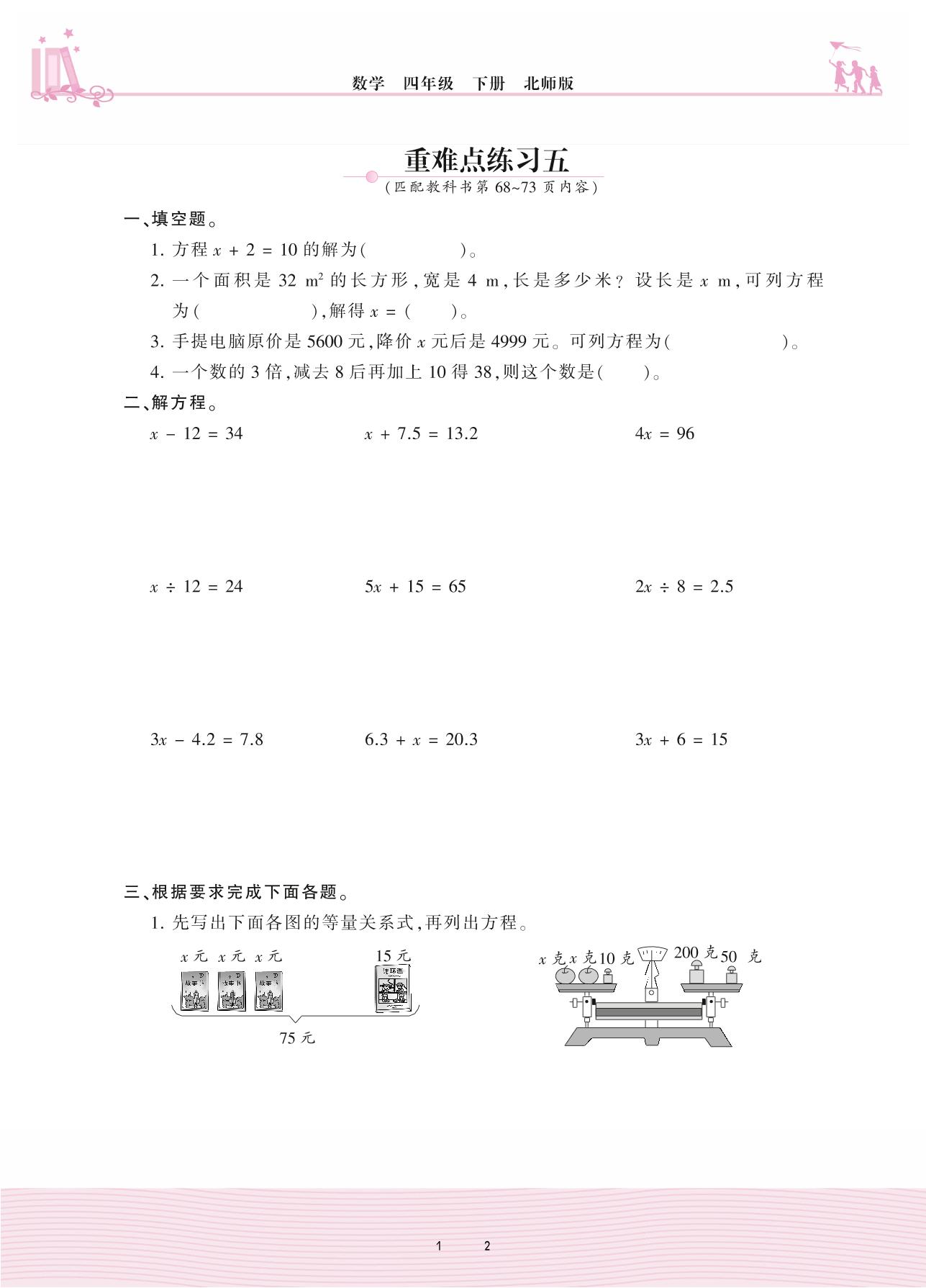 2021下册四年级数学北师版 五 认识方程——重难点练习五