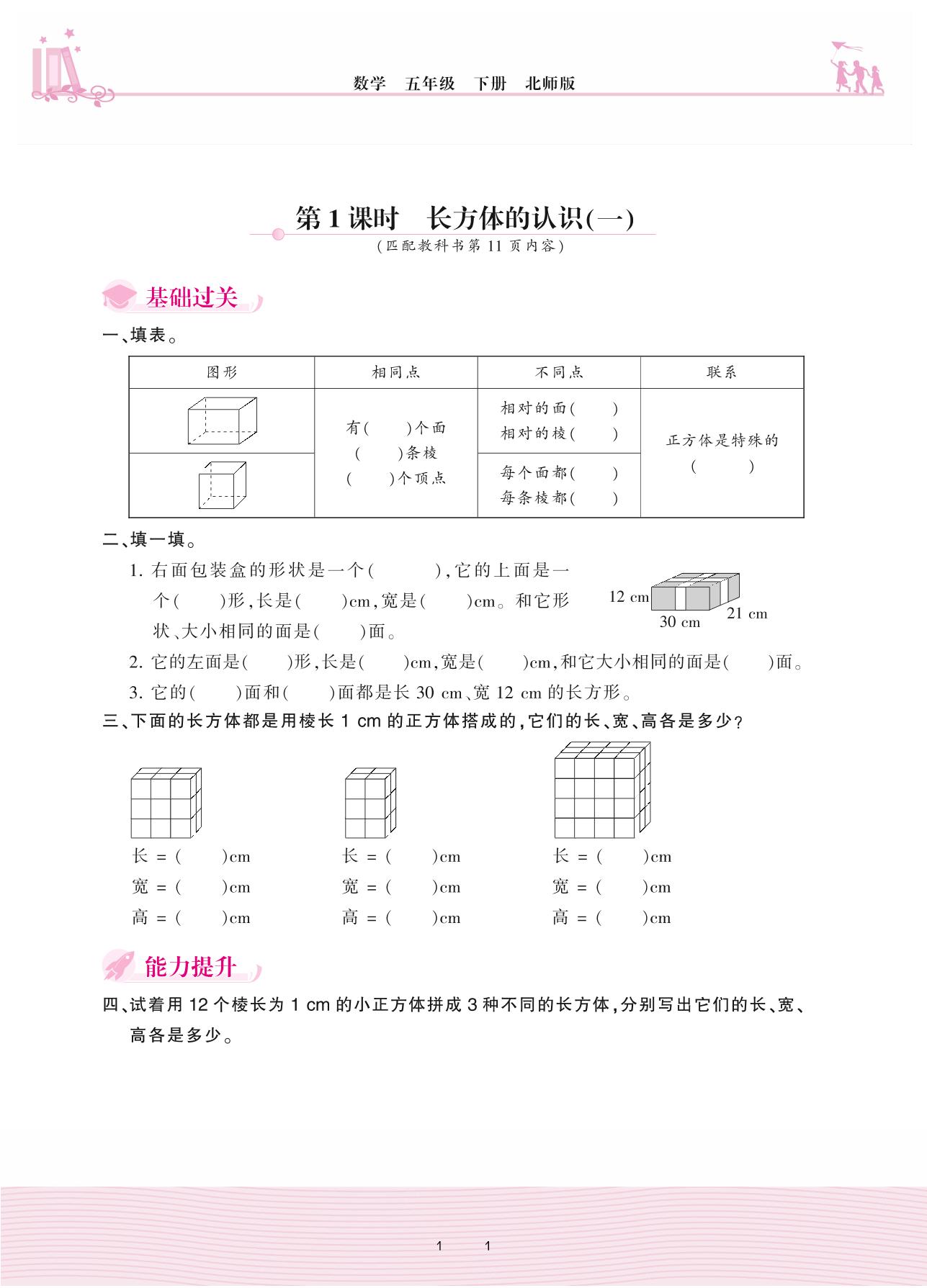 2021下册五年级数学北师版 二 长方体(一)——第1课时 长方体的认识(一)