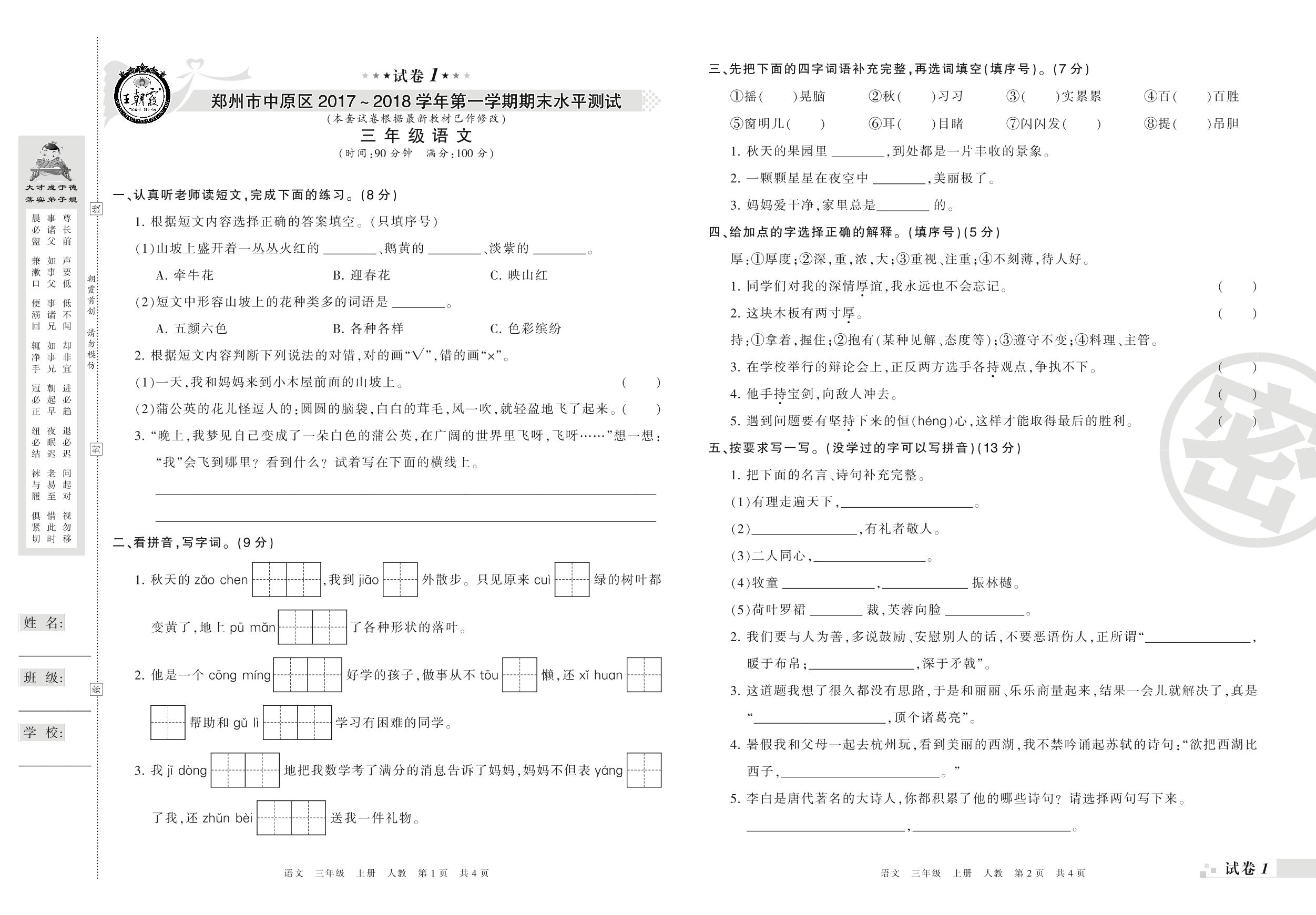 2017-2018学年第一学期郑州市中原区三年级语文试卷(人教版)_R210801103331【1】