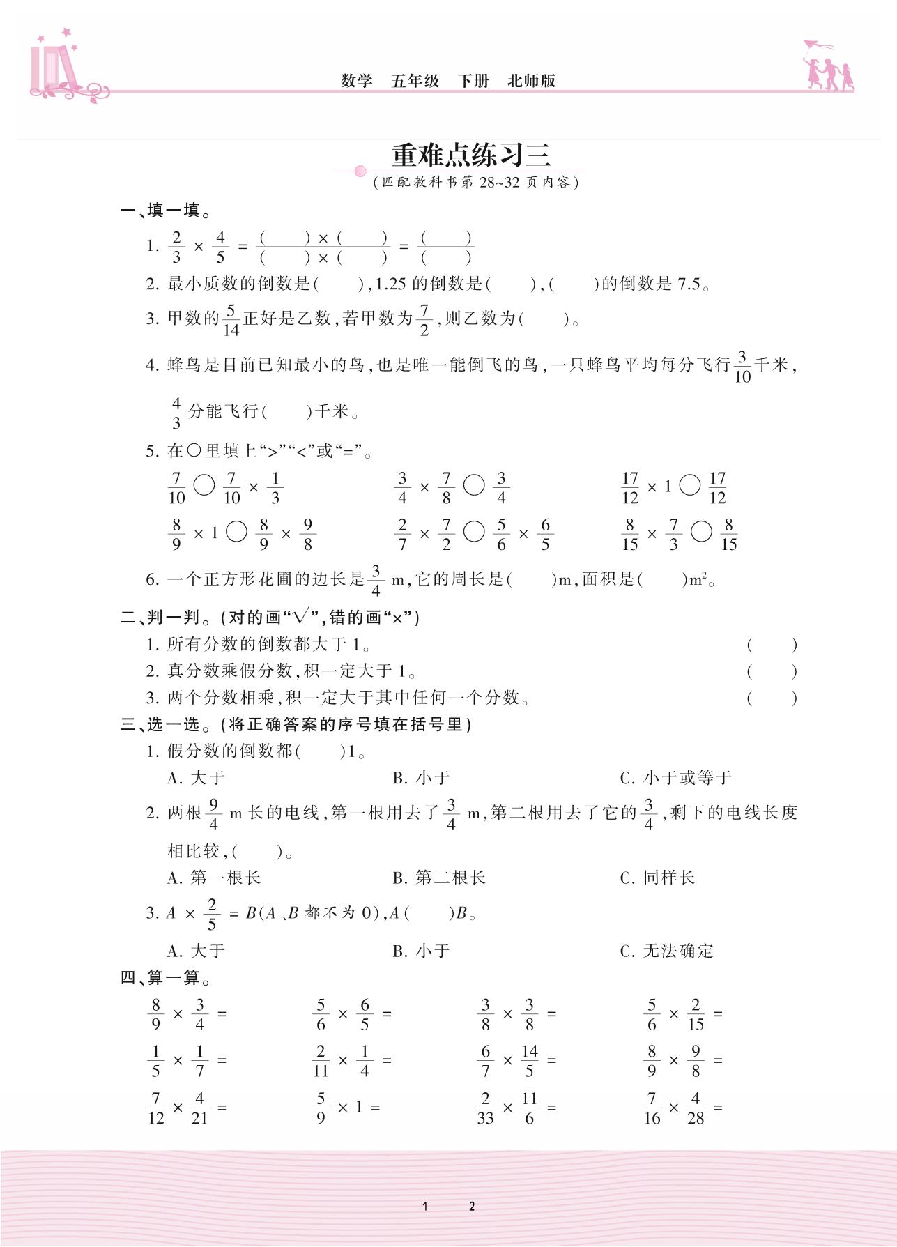 2021下册五年级数学北师版 三 分数乘法——重难点练习三
