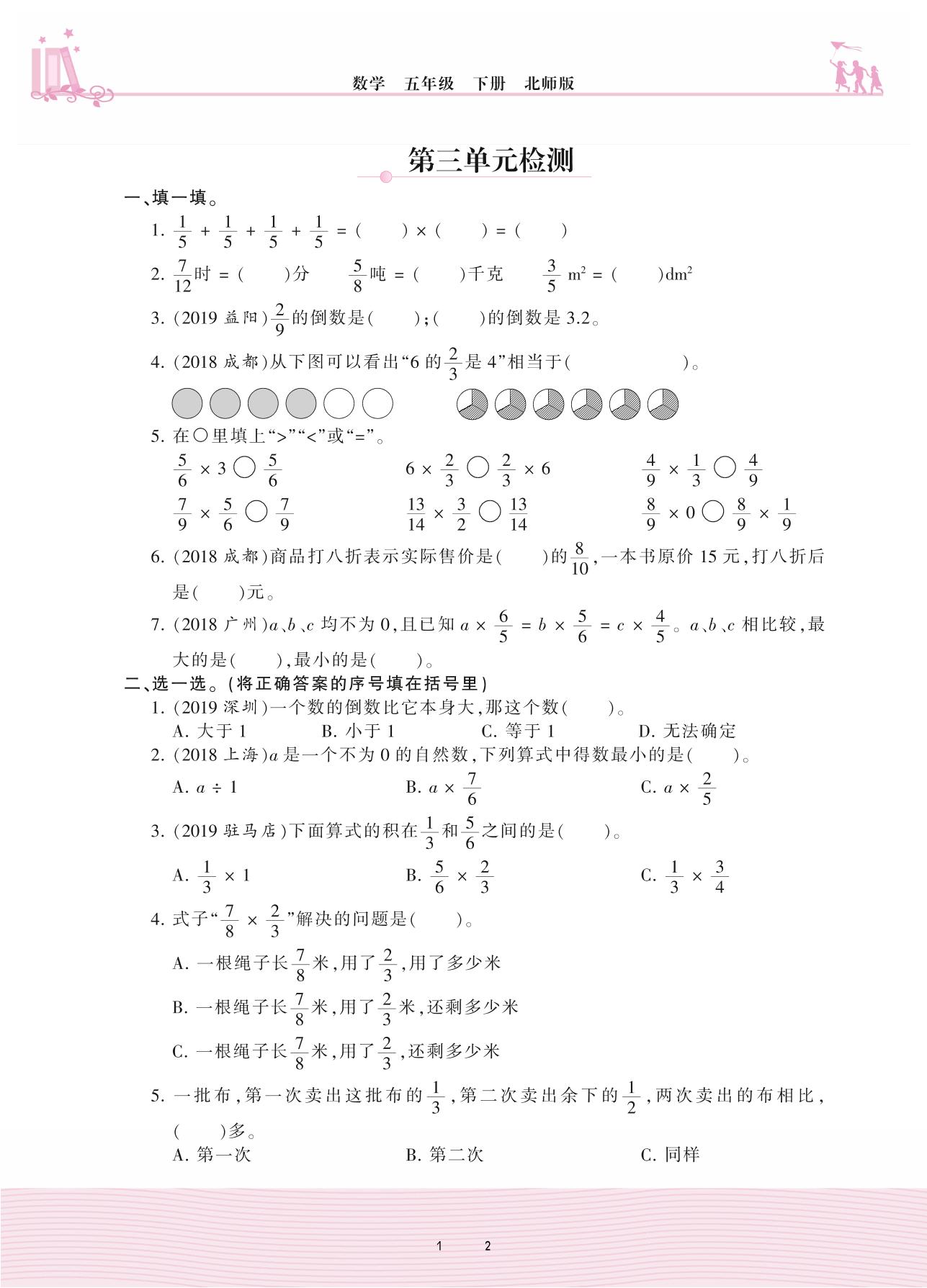 2021下册五年级数学北师版 三 分数乘法——第三单元检测
