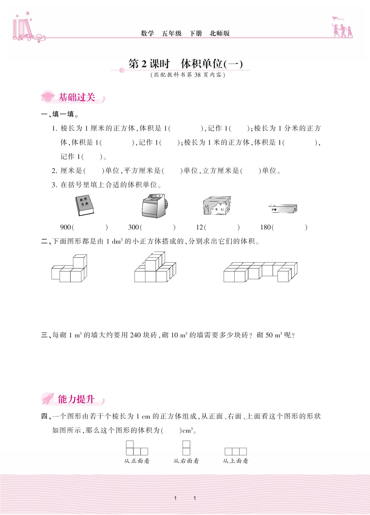 2021下册五年级数学北师版 四 长方体(二)——第2课时 体积单位(一)