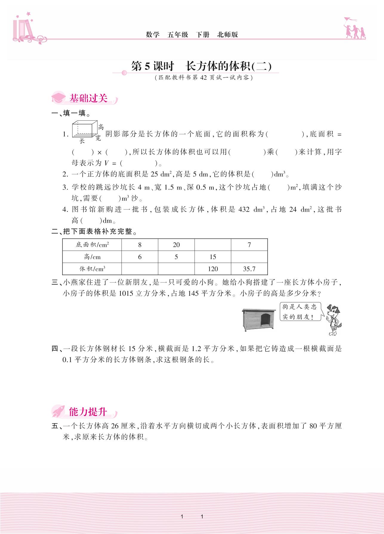 2021下册五年级数学北师版 四 长方体(二)——第5课时 长方体的体积(二)