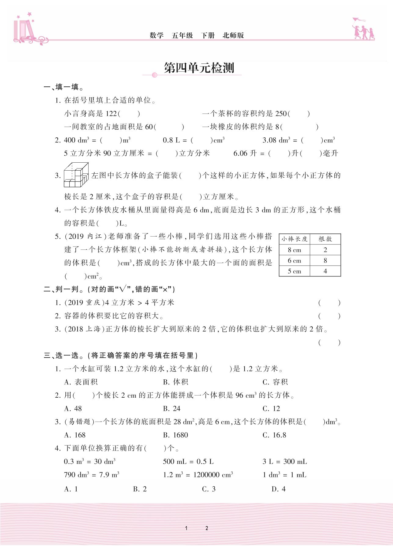 2021下册五年级数学北师版 四 长方体(二)——第四单元检测