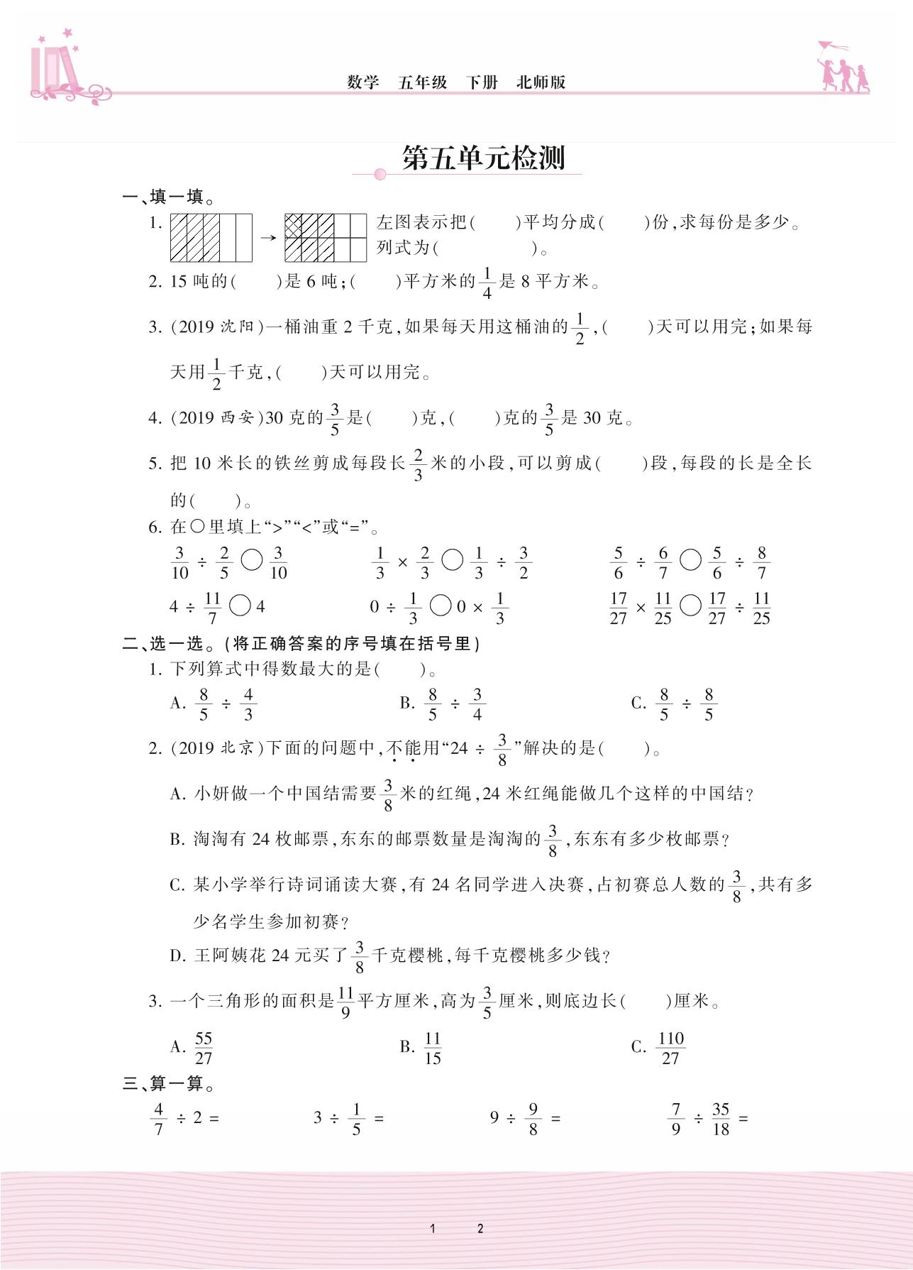 2021下册五年级数学北师版 五 分数除法——第五单元检测