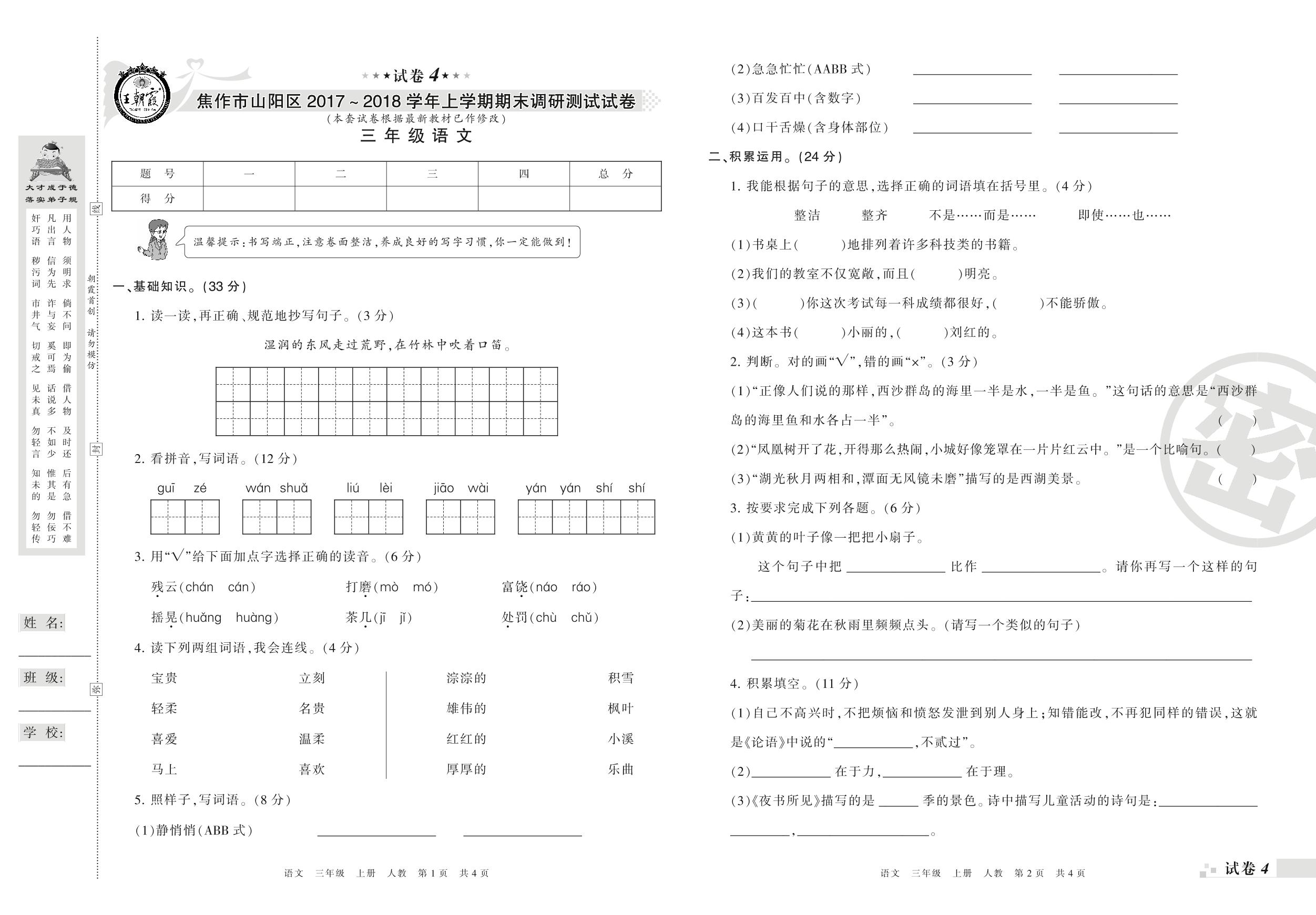 2017-2018学年第一学期焦作市山阳区三年级语文试卷(人教版)【4】