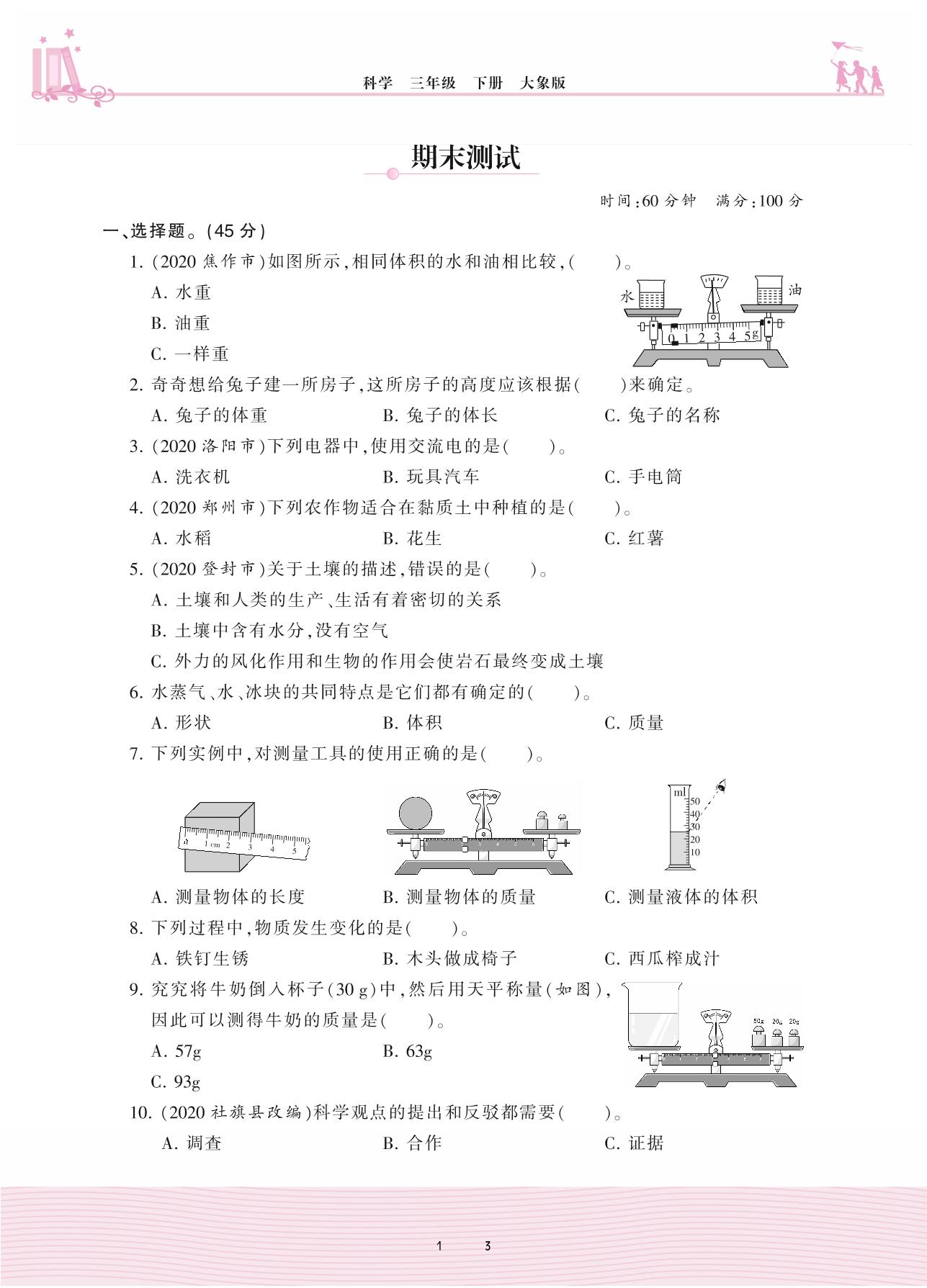 三年级科学大象版下册期末卷