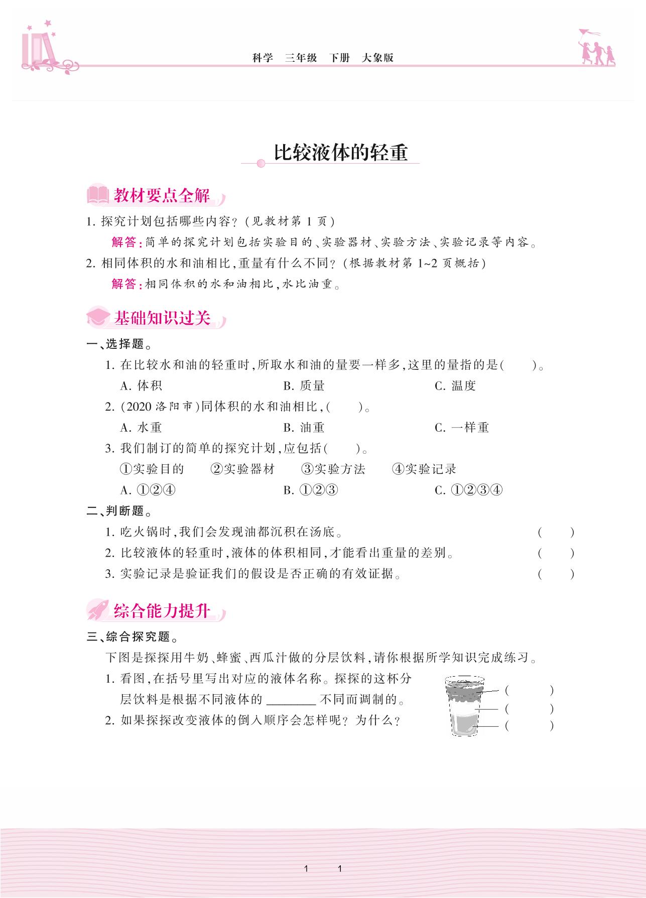 2021下册三年级科学大象版 准备单元——比较液体的轻重