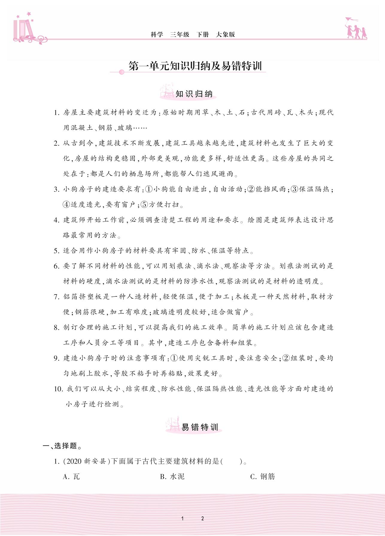 2021下册三年级科学大象版 第一单元 小小建筑师——第一单元知识归纳及易错特训