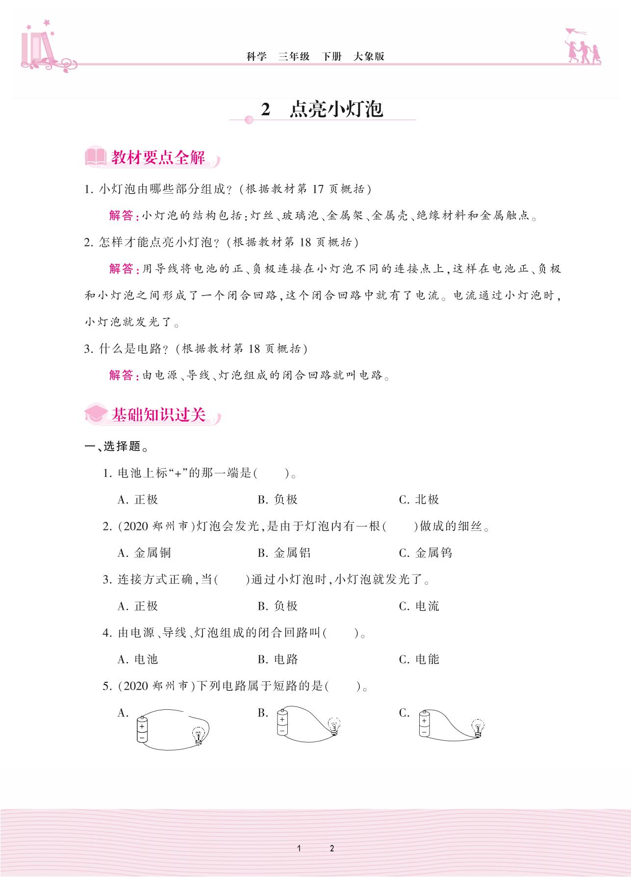 2021下册三年级科学大象版 第二单元 电与我们的生活——2 点亮小灯泡