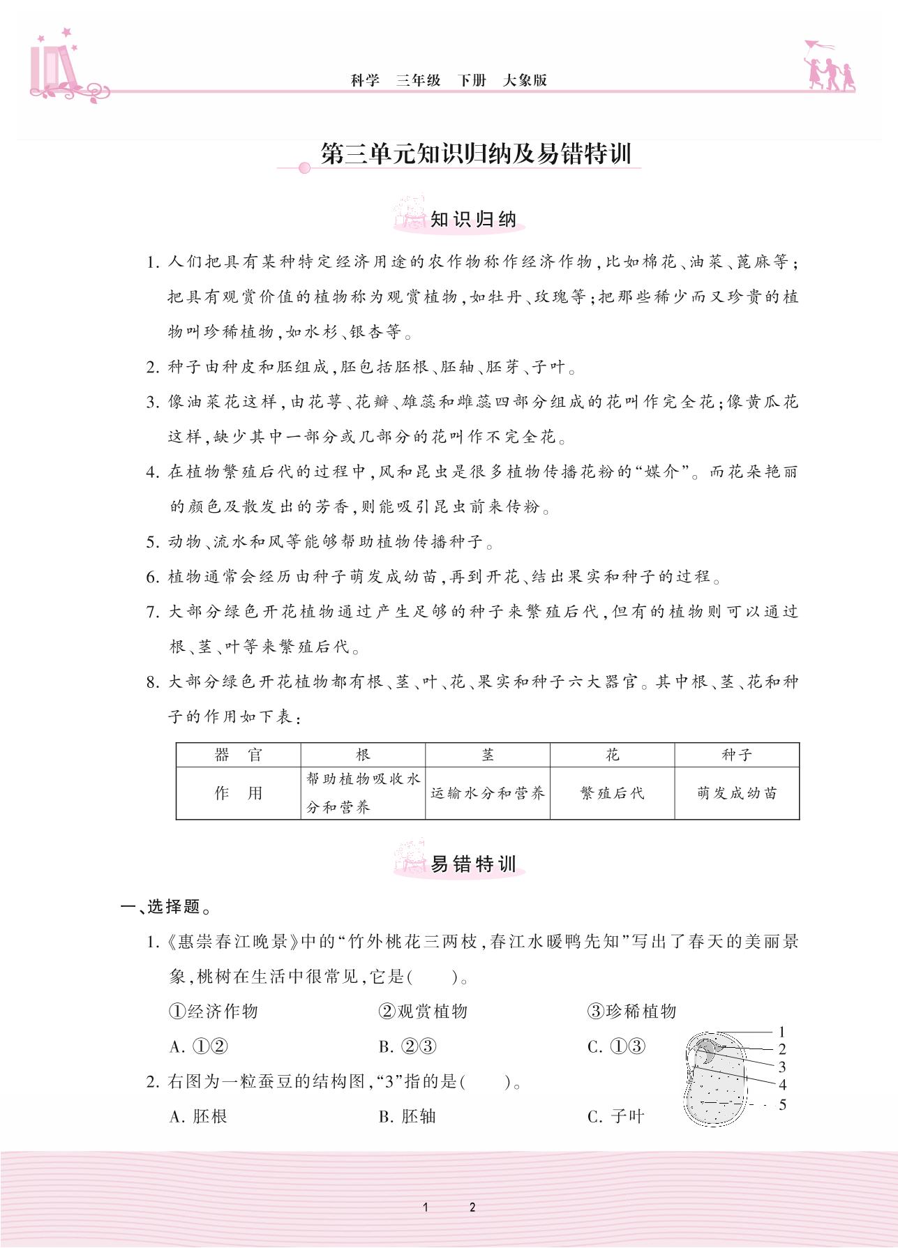 2021下册三年级科学大象版 第三单元 植物的一生——第三单元知识归纳及易错特训