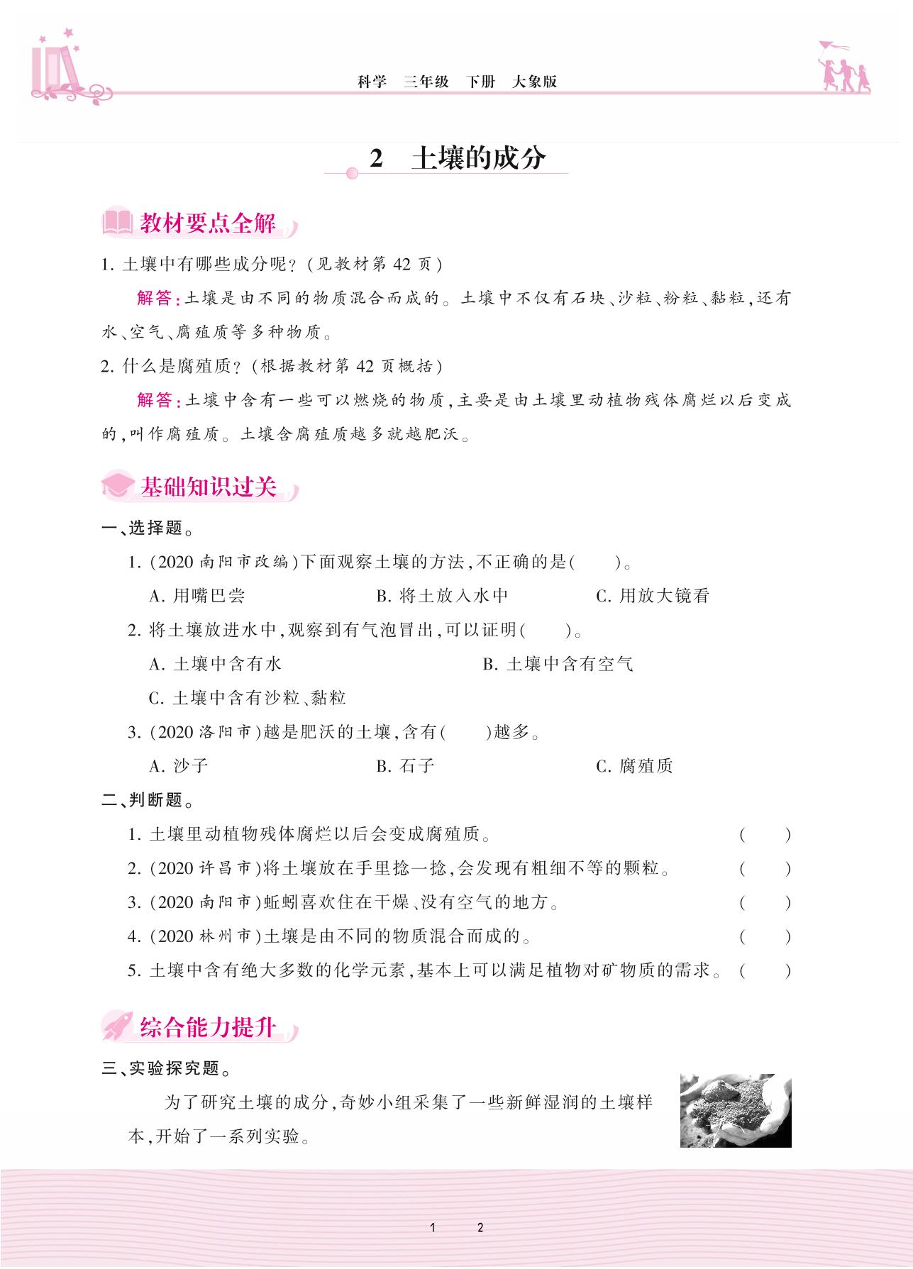 2021下册三年级科学大象版 第四单元 土壤,生命的家园——2 土壤的成分