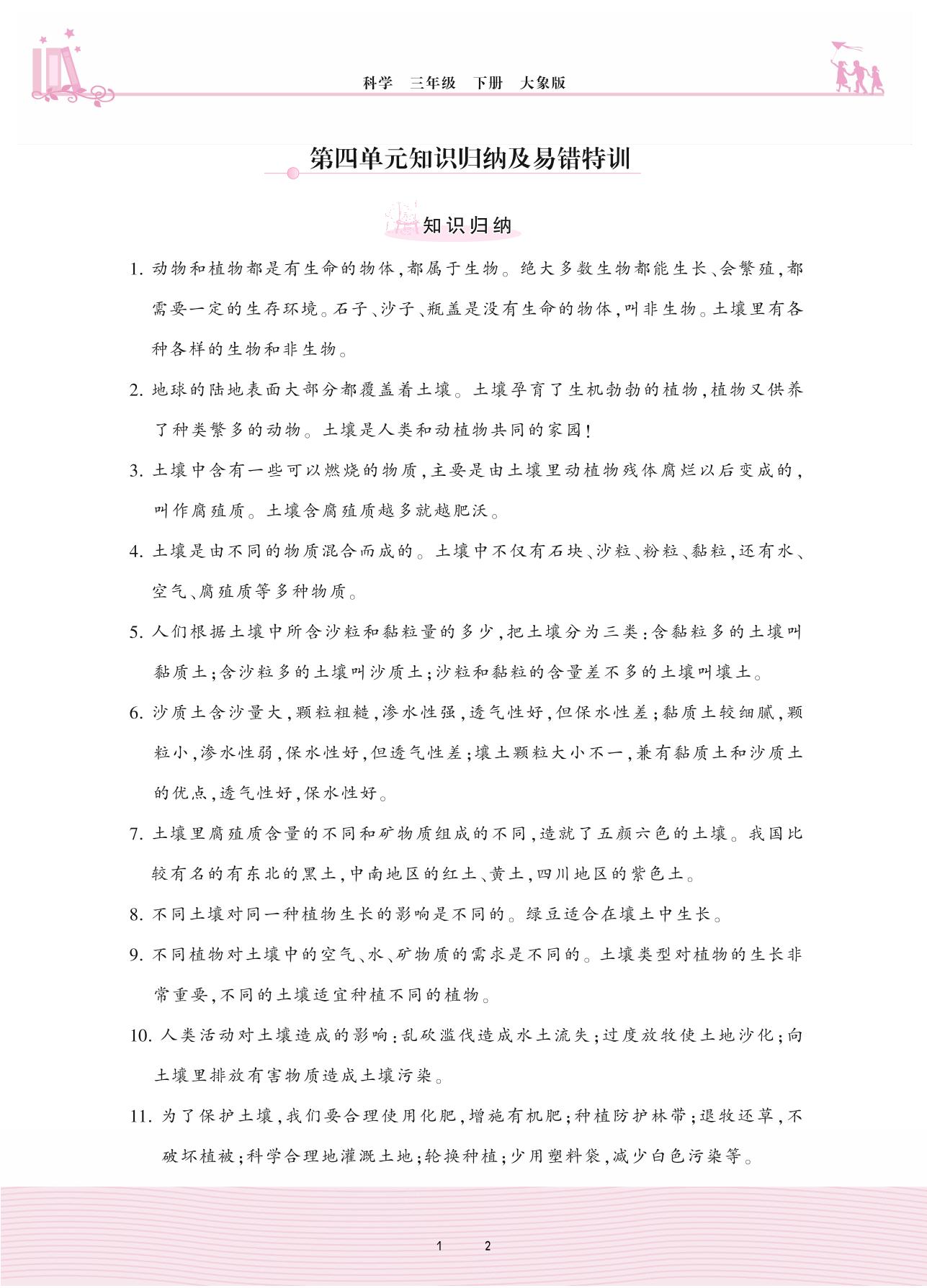 2021下册三年级科学大象版 第四单元 土壤,生命的家园——第四单元知识归纳及易错特训